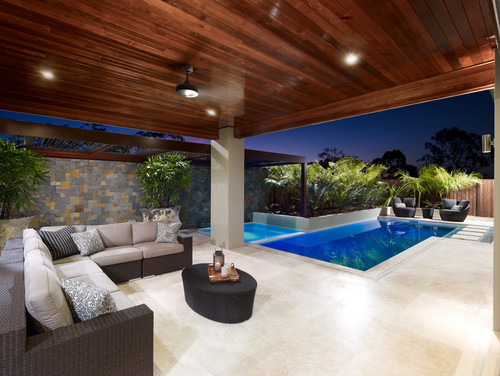 Pavajele antichizate sau periate din travertin creează un spațiu frumos și rafinat în jurul unei piscine. Suprafața lor poroasă absoarbe imediat orice urmă de apă, lăsând zona uscată, fără a aluneca. Așa cum am menționat mai devreme, rămân la aceeași temperatură și nu vor fi o problemă în perioadele foarte călduroase. Pavajele de travertin rezistă și în zonele cu clima foarte rece dar și la temperaturi extreme de îngheț/dezgheț, fără a se crăpa dacă sunt montate corespunzător cu un adeziv special de piatră și medii umede (hidroizolant).