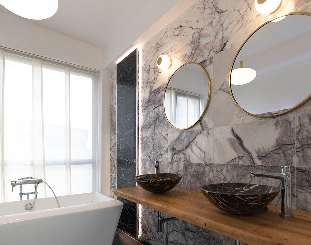 Aici clientul a optat pentru materiale naturale care sa se imbine armonios si sa creeze un décor deosebit. Pentru peretele accent, au ales o marmura Calacatta Lilac cu finisaj polisat cu dimensiunile de 60 x 30 cm. Aceasta se caracterizeaza prin aspect vibrant si rezistenta sporita. Pentru un plus de accent, s-a optat pentru chiuvete din marmura Portoro Gold, a caror venaturi aurii se nasc parca din blatul din lemn. Cada freestanding completeaza aceasta amenajare eleganta. Intrebarea este: ce element iti capteaza mai intai privirea?