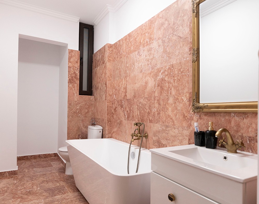 Nu avem cum sa nu observam rama si robinetii aurii care nu incarca inutil spatiu, ci dimpotriva. Sunt acele piese care nu ar trebui neglijate. Pentru pardoseala si pereti, proprietarul si-a dorit o nuanta puternica si totusi care sa nu deranjeze vizual, si tocmai de aceea a optat pentru travertin Red Cross Cut cu finisaj polisat, o piatra naturala indrazneata, ce impresioneaza prin bogatele nuante de rosu, maro deschis si bej. Avand in vedere ca a ales obiecte sanitare albe, travertinul Red este exact acea pata de culoare de care aceasta baie avea nevoie.