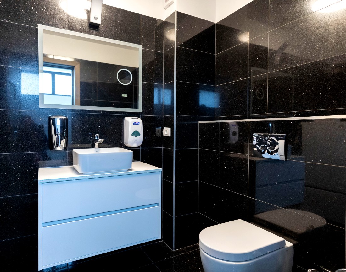 Indiferent de amenajarea pe care o alegi, indiferent pentru ce stil de obiecte sanitare optezi, o amenajare in alb si negru nu va da gres niciodata. Aici, clientul a ales sa se joace cu un astfel de contrast, folosindu-se de granitul Black Galaxy cu finisaj polisat, o piatra naturala ce ascunde un intreg univers in textura sa, fiind cel mai spectaculos tip de granit. Prin culoarea indrazneata, ofera amenajarii o stralucire aparte, astfel ca a obtinut un spatiu modern si rafinat in acelasi simp. Liniile simple ale mobilierului si rama minimalista a oglinzii, aduc acel touch final de care aceasta amenajare avea nevoie pentru a putea fi inclusa in categoria celor moderne.