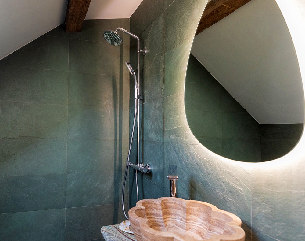 Verdele menta al ardeziei de pe pereti iti atrage rapid atentia, iar combinatia dintre aceasta si chiuveta in tonalitati crem, parca este exact ceea ce trebuia. Pentru placarea verticala a acestei bai, s-a optat pentru placi de ardezie verde menta, un produs care aduce o parte din calmul naturii la tine acasa. Aceasta amenajare este completata de blatul din marmura Rain Forest Green cu finisaj polisat, asezat pe un schelet metalic ce aduce un strop de design industrial in aceasta amenajare moderna. Chiuveta din onix este acea pata de care amenajarea avea nevoie pentru a putea oferi acea senzatie de calm. Ai observat grinzile de lemn din tavan?