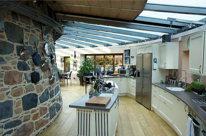 Acest tip de bucatarie este destinat familiilor cu mai multi membri, care au nevoie de spatii de depozitare mai incapatoare si de o zona mai ampla pentru pregatirea mesei. Prezenta hotei este obligatorie pentru indepartarea mirosurilor si a fumului. Masa este in general amplasata in dreptul peretelui liber.