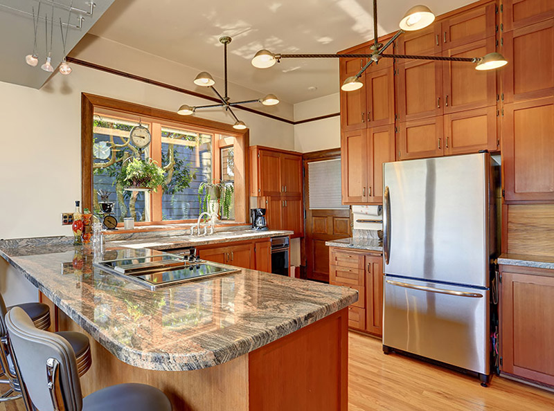 - pardoseli din piatra naturala, in montaje si culori felurite, cu diferite finisaje, compatibile sau nu cu sistemele de incalzire in pardoseala, dupa caz. Se folosesc placi mari din marmura, ardezie, granit, travertin sau calcar, acestea se monteaza in prelungirea celor din bucataria deschisa sau vor fi diferite de acestea, potentand ideea de spatiu cu destinatie diferita;