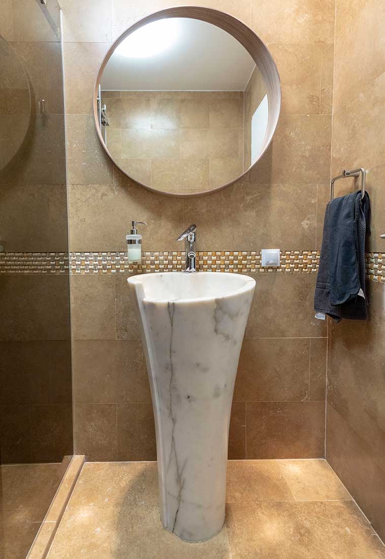 PIATRAONLINE sustine amenajarile de bai de apartament sau de casa, pentru spatii rezidentiale sau publice, indiferent de dimensiunea si forma acestora. Piatra naturala, ca element ecologic si sustenabil, creeaza, prin culoare si textura, un stil unic si un aspect deosebit.