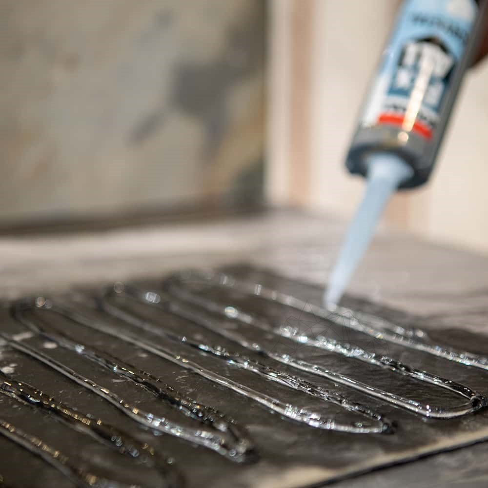 6. Se aplica adezivul in sarpe pe spatele foii (acest procedeu se foloseste pentru adezivii livrati in tub de 290 ml si pentru cei in folie de 600 ml) La folosirea adezivului livrat la galeata de 4 kg ( Soudal Fix All Floor & Wall) se aplica adezivul prin imprastiere cu ajutorul unei gletiere (tehnologia prin pieptanare - atentie la margini). Se recomanda gletiera tip B3 (se folosesc si denumirile spaclu zimtat, spatula dintata, spaclu pentru adezivi)