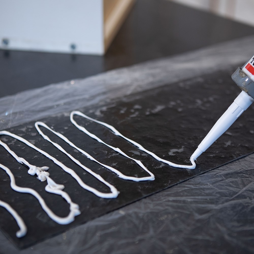 6. Se aplica adezivul in sarpe pe spatele foii (acest procedeu se foloseste pentru adezivii livrati in tub de 290 ml si pentru cei in folie de 600 ml) La folosirea adezivului livrat la galeata de 4 kg ( Soudal Fix All Floor & Wall) se aplica adezivul prin imprastiere cu ajutorul unei gletiere (tehnologia prin pieptanare - atentie la margini). Se recomanda gletiera tip B3 (se folosesc si denumirile spaclu zimtat, spatula dintata, spaclu pentru adezivi)