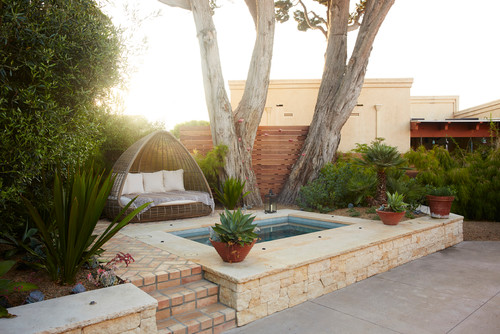 Terasa este o zonă importantă – ghivecele masive pentru flori, pardoseala deschisă la culoare şi mobila relaxantă sunt elemente indispensabile pentru o atmosferă pe care cei mai mulţi o asociază cu panoramele grandioase către mare. O posibilă variantă pentru a amenaja exteriorul casei pentru o atmosferă mediteraneană este o construcţie care porneşte de la o piesă principală (o fântână arteziană sau o cismea) către zone de recreere, totul punctat de ghivece cu flori viu colorate.