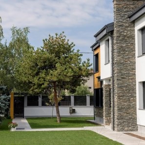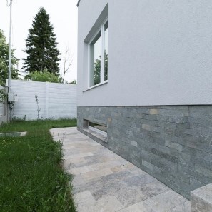Simetria, indiferent unde aceasta este folosita, va fi resimtita ca monotona. In acest caz, pot fi folosite lespezile poligonale din ardezie Kavala, o solutie ideala care sparge monotonia si care introduce un element inedit in amenajarea curtii. In acelasi timp, aceste produse din piatra naturala, au si functia de a proteja iarba, realizand un joc cromatic echilibrat intre vegetatie si piatra.