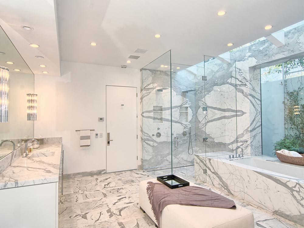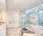 Stalpi din marmura ce sustin dusuri de cap cu baterii ingropate, bordate cu pereti din mozaic multicolor si asternuti pe o pardoseala din travertin in placi mici, toate aduse intr-un baroc controlat, moale, prietenos. Asocierea dintre peretii de marmura venata si pardoseala din travertin mat, aducand in joc amintirea unor vremuri pierdute, balanseaza optimismul superficial al peretilor din mozaic si totul se desfasoara intr-un spatiu generous, care ajuta imaginea dusului noii toamne.