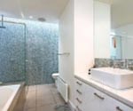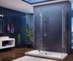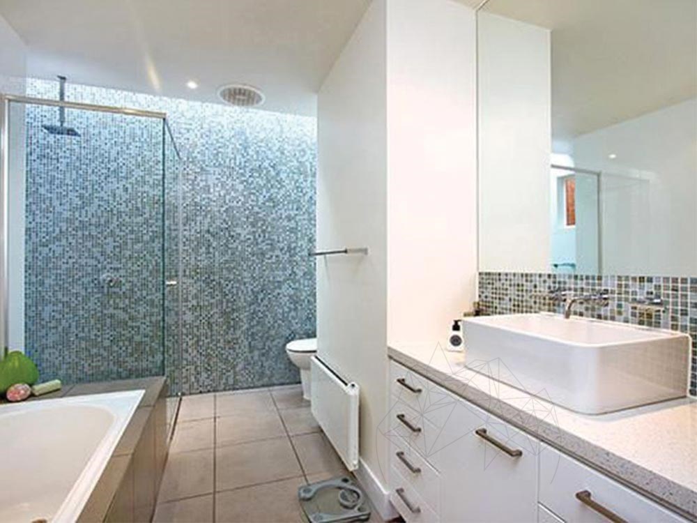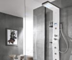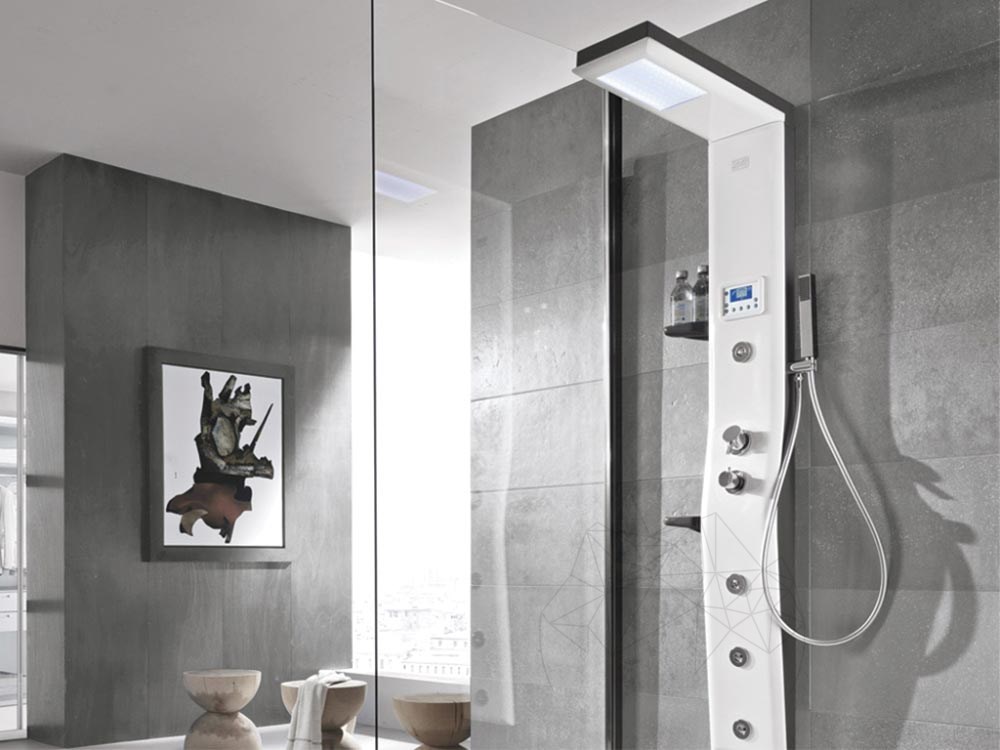 Un dus pentru doi de un modernism pur, elaborat, moderat tehnic si fara sofisticarii inutile, cu sticla transparenta si un perete in mozaic inchis la culoare. O amenajare echilibrata, completata de o bancuta comuna, tot in mozaic, ca o invitatie catre petrecerea unor minute de relaxare intr-o companie dorita. Sau o introspectie plina de farmecul apei invadand prin invaluire.