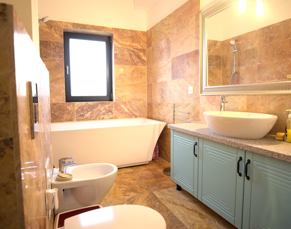 Pentru aceasta baie, proprietarul a ales sa foloseasca travertin Peach, atat pentru pardoseala, cat si pentru placarile verticale. Intreaga amenajare este armonizata cu dulapul turcoaz ce imblanzeste semnficativ spatiul. Pentru un plus de rezistenta, s-a folosit un blat de granit Peach Red. Ca sa nu incarce prea mult spatiul vizual, proprietarii au optat pentru obiecte sanitare albe, simple care sa nu incarce prea mult spatiul.