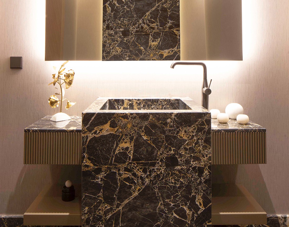 Decorul maximalist este reprezentat perfect cu ajutorul marmurei Portoro Gold, sursa foto: PIATRAONLINE