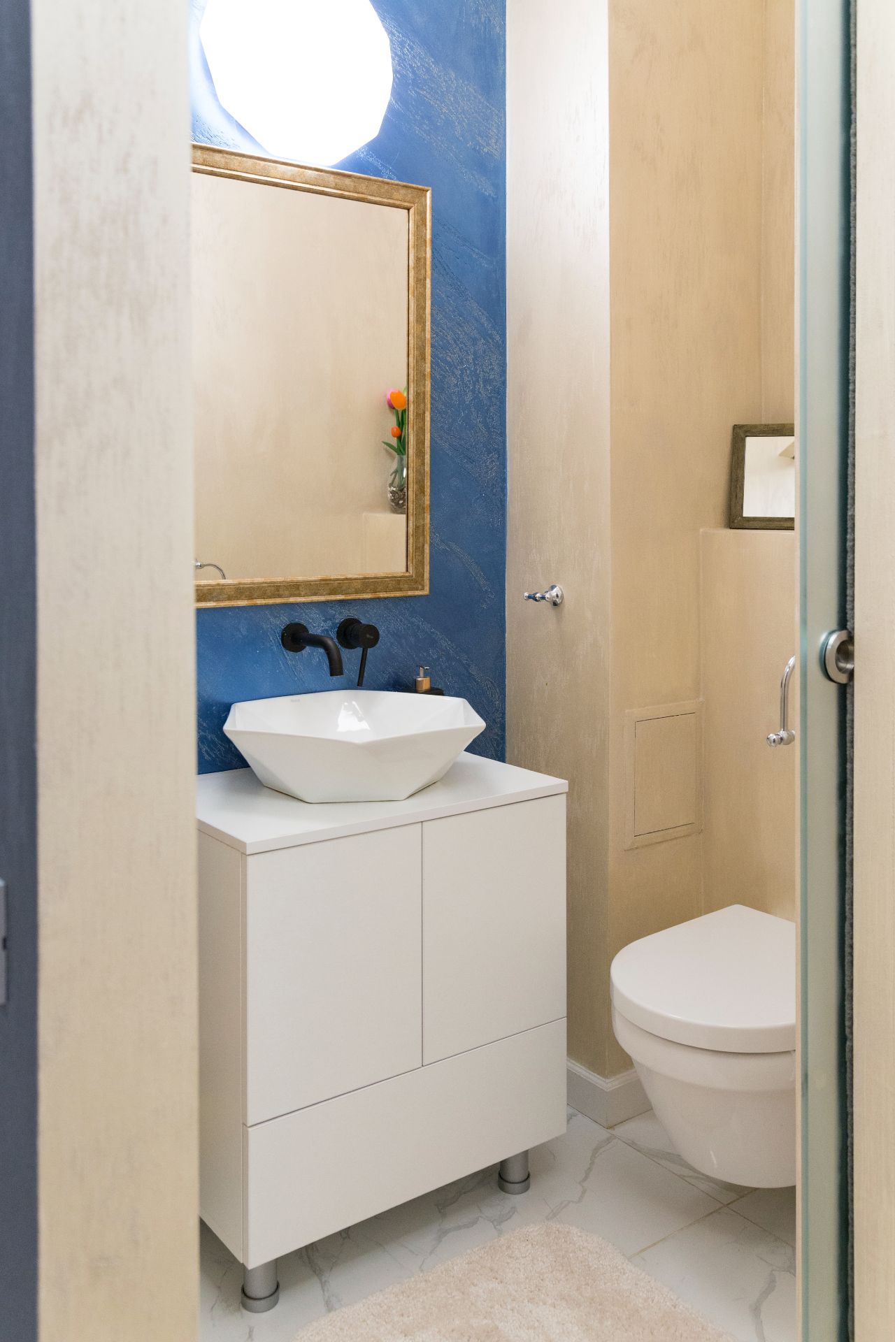 Pentru amenajarea baii din acest proiect, arhitectul a apelat la vopsea decorativa pentru pereti, peste care a aplicat un strat protector special, dedicate suprafetelor ce prezinta umiditate. Pentru a oferi protective in plus in jurul cazii de baie, arhitectul a ales placi ceramice hexagonale cu aspect de marmura Calacatta. In plus, ”piesa de rezistenta a aceste bai, este chiuveta free-standing din marmura Calacatta”.