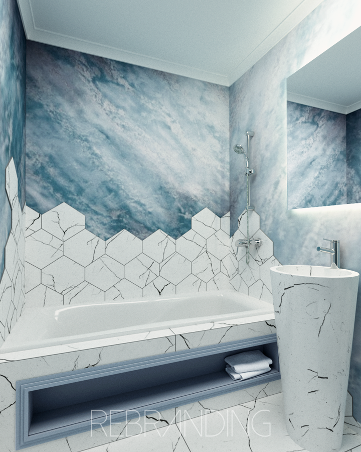 Randare cu amenajarea baii cu marmura Calacatta, sursa foto: rebranding.ro