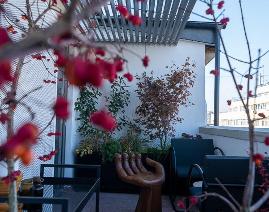 A.C.: Este tot o referinta la arta si sculptura. Ne-a placut in primul rand aceasta versatilitate a lui de a fi o sculptura in timp ce este un obiect functional. In plus, ni s-a parut perfect in cadrul peisagistic creat de Luminita de la Primitiv Plants care a transformat terasa intr-o oaza de bucurie in mijlocul orasului.