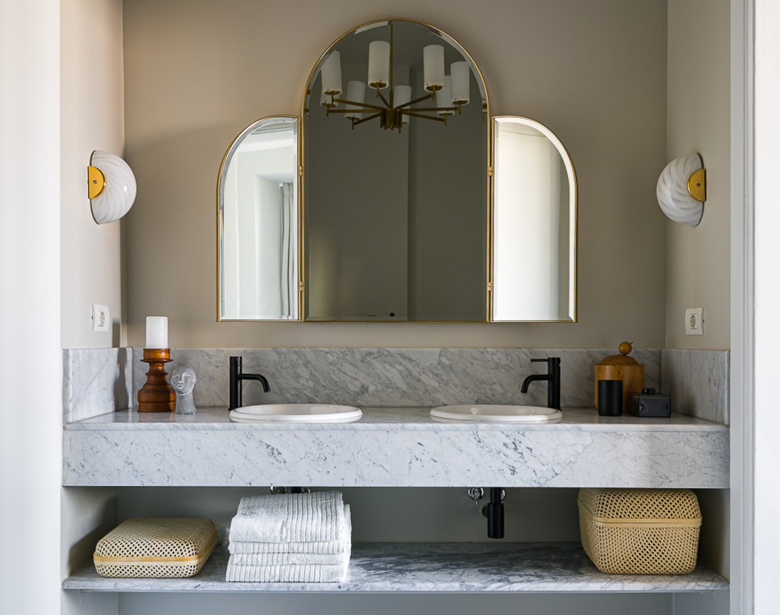 A.C.: Baia matrimoniala este in totalitate placata cu marmura. Proprietarii au cerut asta in mod specific si noi am fost incantate sa lucram cu acest material. Cat despre statueta, includem mereu in stylingul proiectelor noastre arta, cunoscuta sau mai putin cunoscuta sau chiar necunoscuta. Credem ca arta buna, originala, autentica, chiar si anonima eleveaza un spatiu la orice nivel estetic s-ar afla acesta deja.
