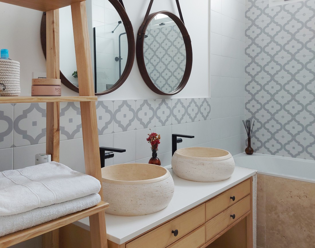 Baia inglobeaza mai multe elemente de lemn, piatra naturala si ceramica, sursa foto: In House Design