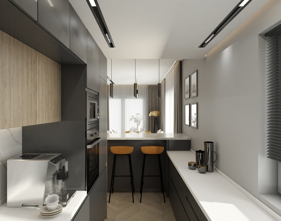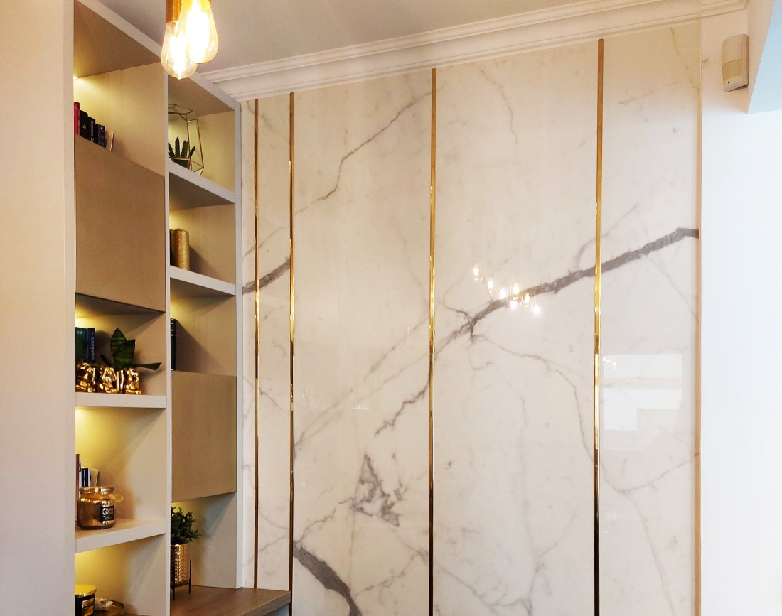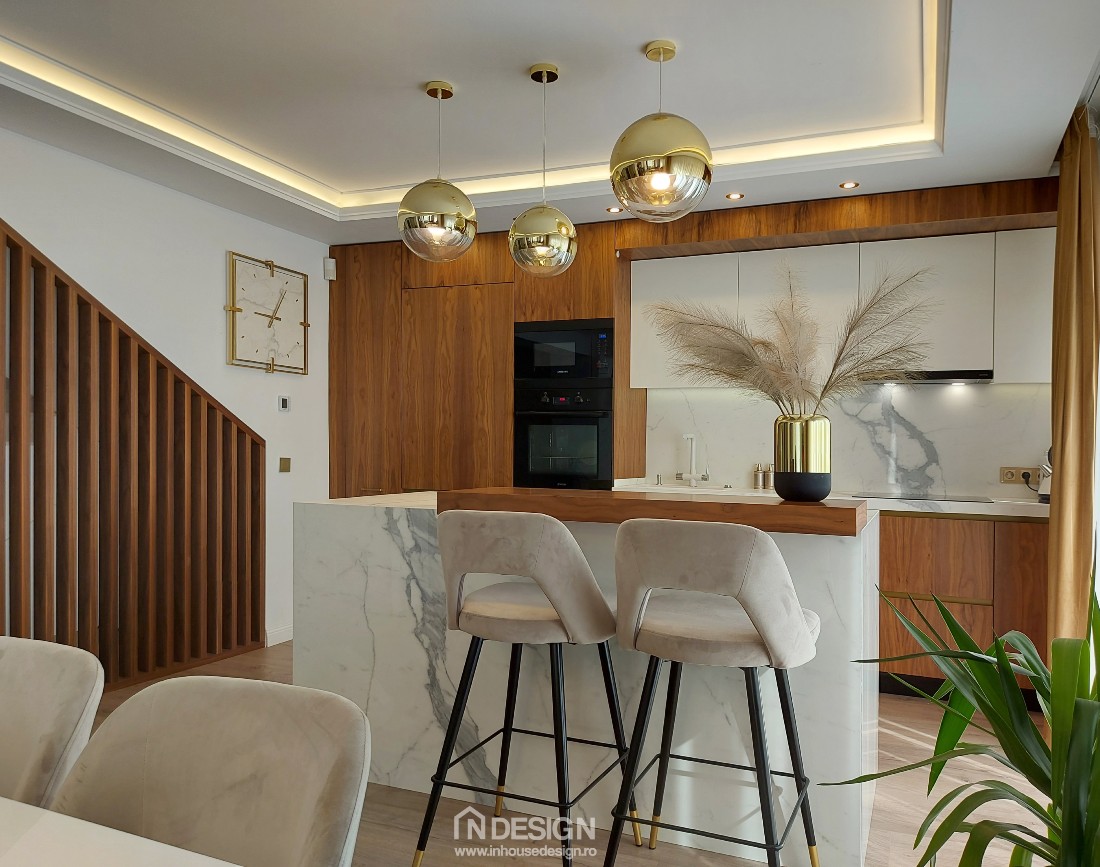 Insula bucatariei este placata cu lastre ceramice, decor de marmura Calacatta. De asemenea, peretele comun cu zona de living, pe de-o parte si cealalta, este placat cu acelasi decor pe verticala, cu insertii metalice aurii.