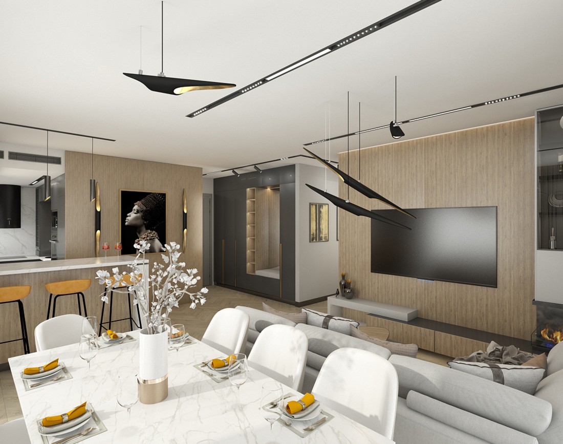 F.B.: Ca in toate proiectele mele, am gandit spatiul astfel incat sa imbin esteticul cu functionalul. Configuratia planimetriei mi-a permis sa organizez o bucatarie deschisa intr-un colt retras al open-space-ului, iar legatura dintre camera de zi si bucatarie sa fie creata printr-o peninsula orientata catre zona de zi. In stransa legatura cu bucataria am plasat zona de dining, care se bucura de lumina naturala de pe doua directii. O provocare pe care am depasit-o cu succes a fost tratarea holului de intrare ca pe o parte integranta a zonei de zi. Beneficiarul nu a dorit sa delimiteze holul de intrare. De aici si pana la a crea o legatura stransa intre zona de living si zona de intrare a fost doar un pas. Placarea pe verticala a peretilor cu placi MDF furniruit si folosirea tocurilor filomuro au intregit imaginea de ansamblu a zonei de zi.