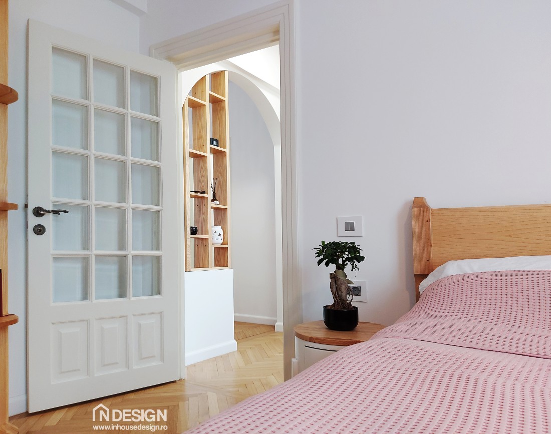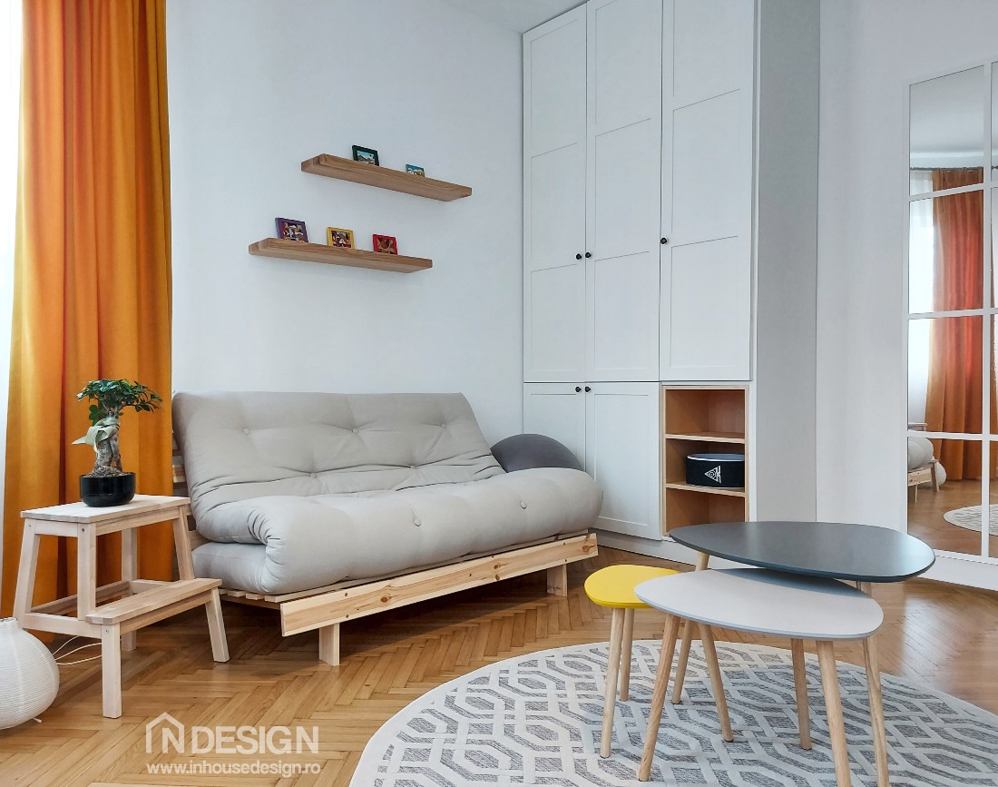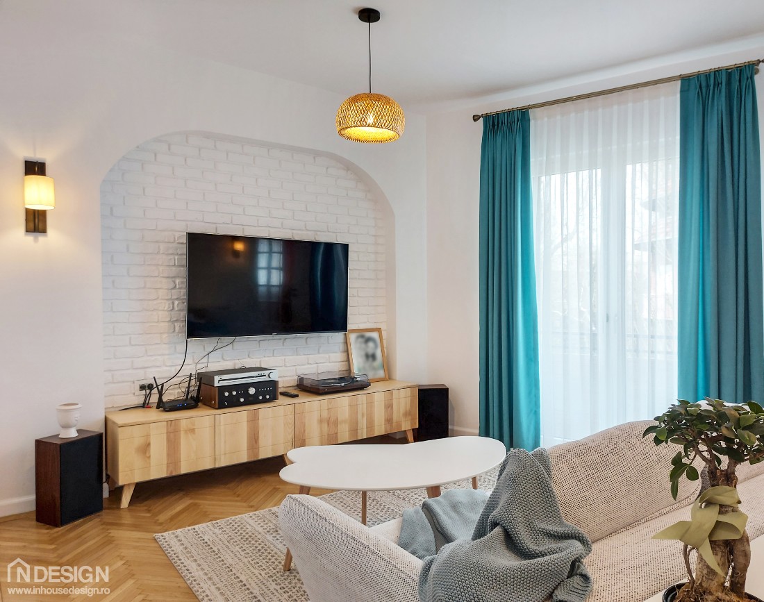 Beneficiarii, un cuplu tanar si energic, si–au dorit o amenajare in stil boho-scandinav. Proiectul a ridicat mai multe provocari pe parcursul implementarii, din pricina vechimii cladirii, dar si a formelor deosebite ale camerelor. Cu toate acestea, m-am identificat foarte mult cu stilul abordat si m-am pliat cu usurinta pe cerintele beneficiarilor, realizand o fuziune de succes intre stilul boho, (boem si cald) si stilul scandinav (frumusete minimalista).