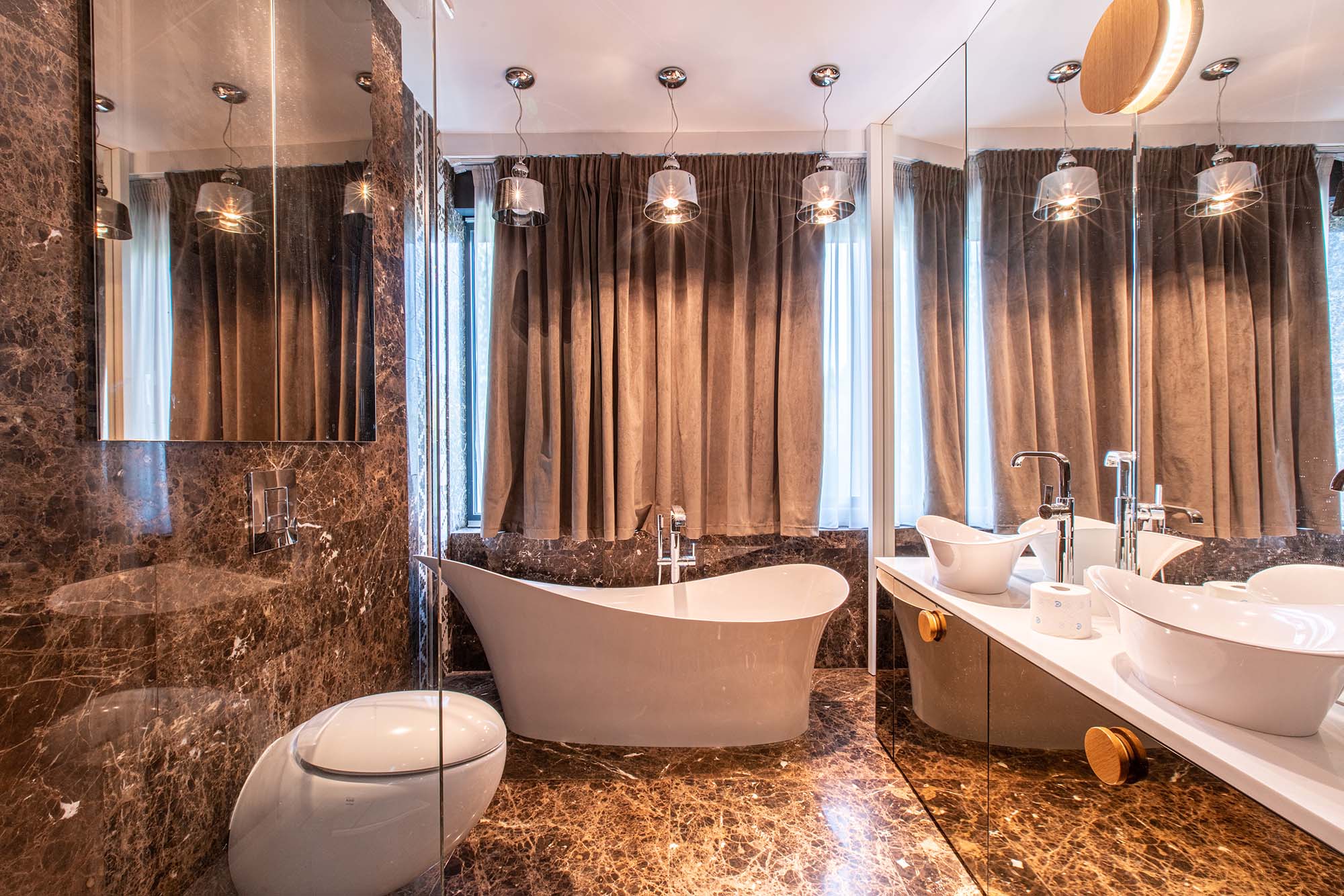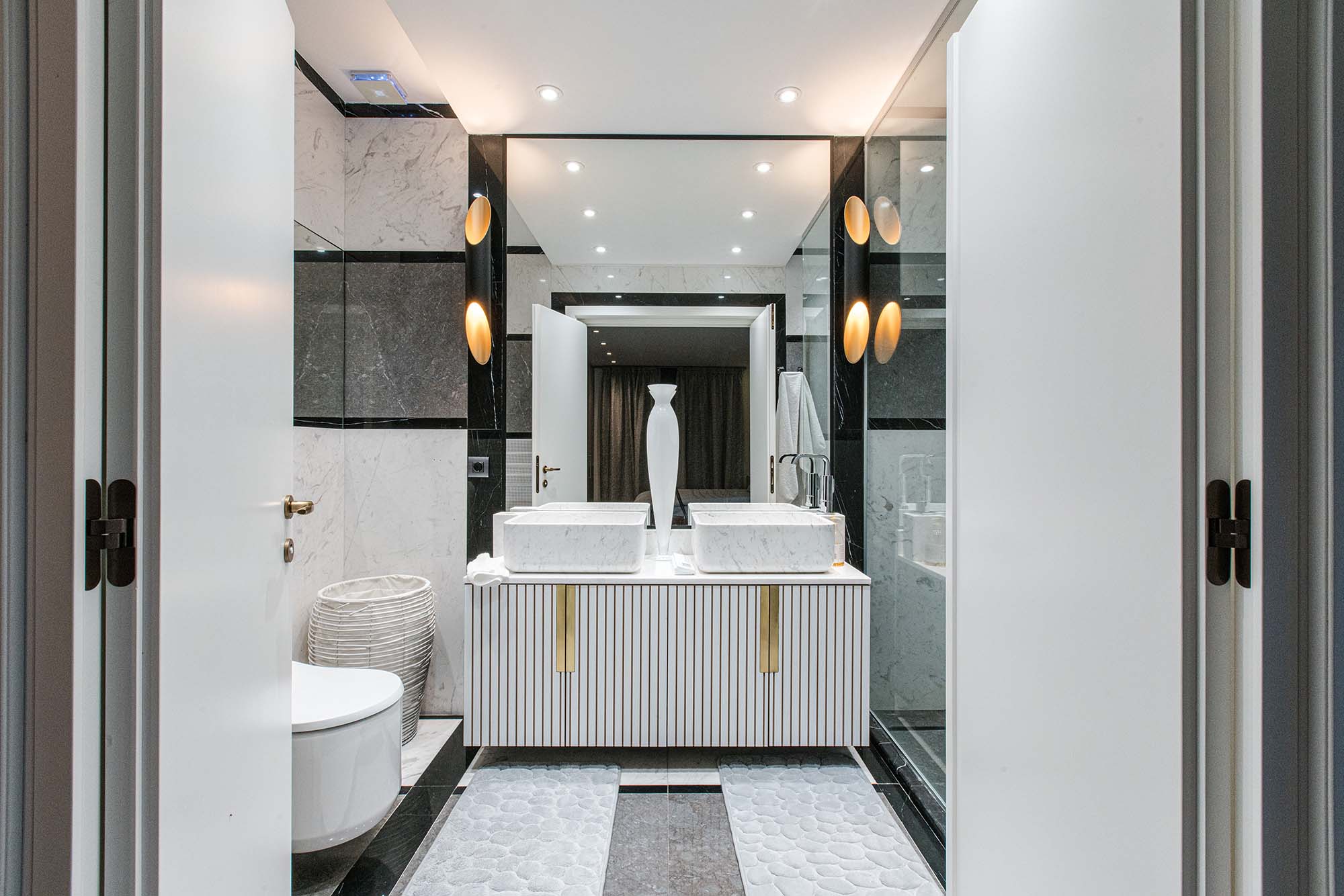 Băile de lux au menirea de a oferi o experiență de relaxare și răsfăț oaspeților. Marmura contribuie la crearea unei atmosfere spațioase și calmante, oferind un sentiment de lux și confort. Fie că este vorba despre o cadă din marmură sau despre un duș cu finisaje din marmură, aceste elemente devin punctele de atracție ale băii, adăugând un farmec elegant și revigorat spațiului. Textura răcoritoare și designul fin al marmurei completează perfect senzația de relaxare și binecuvântare.