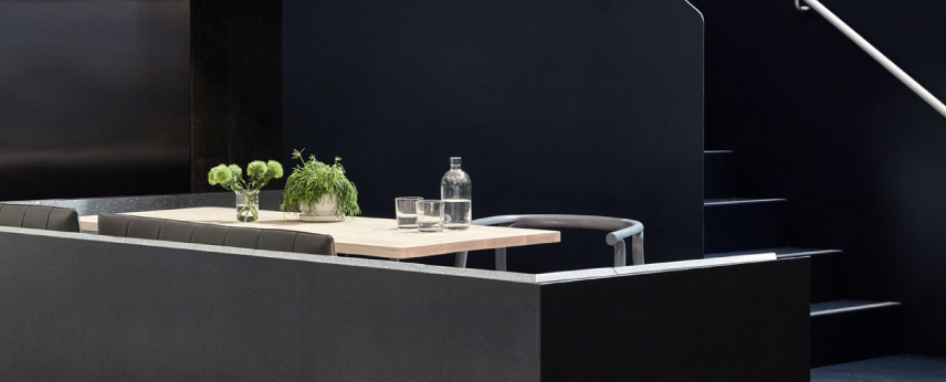 Blatul pentru insula de lucru este din steatit si este un material folosit in prezent pentru prepararea mancarii sau in amenajarea spatiilor Horeca, provenind dintr-o cariera din Quebec. Steatitul era folosit pe vremuri in laboratoare, iar rezistenta sa la socurile termice l-au transformat in materialul ideal care sa reziste la o temperatura de -196 de grade Celsius provocata de azot. Si in acest proiect, caramida este cea ca conserva istoria locului si o duce mai departe intr-un altfel de spatiu.