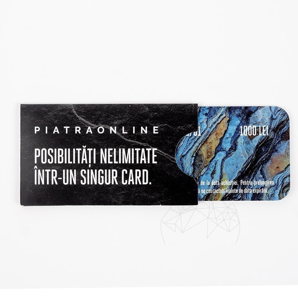 Daruieste posibilitati nelimitate cu noul card cadou PIATRAONLINE in valoare de 1000 lei ! Surpinde-i pe cei dragi, alege suma dorita, comanda-l online si da-l mai departe. Cadou de casa noua, intr-o etapa noua a vietii sau din simpla dorinta de a oferi. Blaturi de bucatarie, lavoare sau cadite, editii limitate de kitchenware sau gratare, totul din piatra naturala! Cardul cadou este valabil 1 an de la data achizitionarii!”