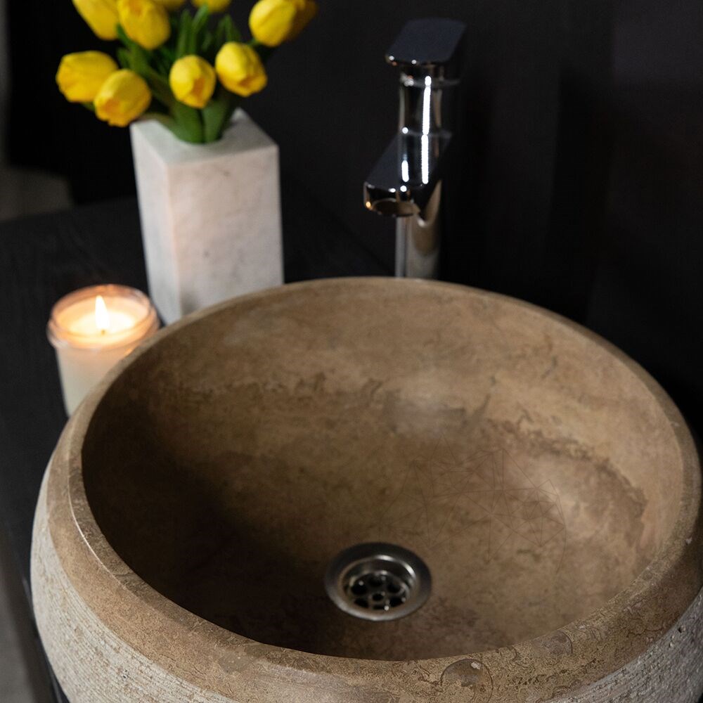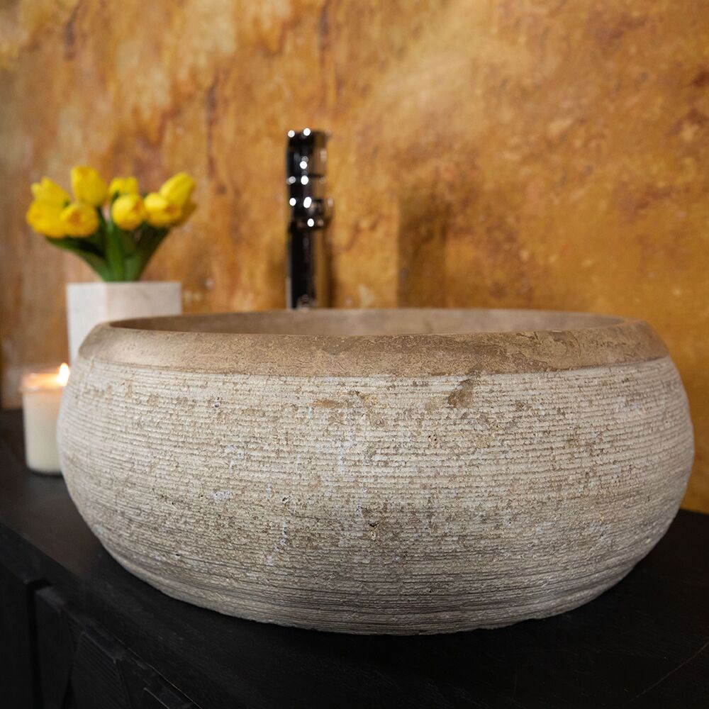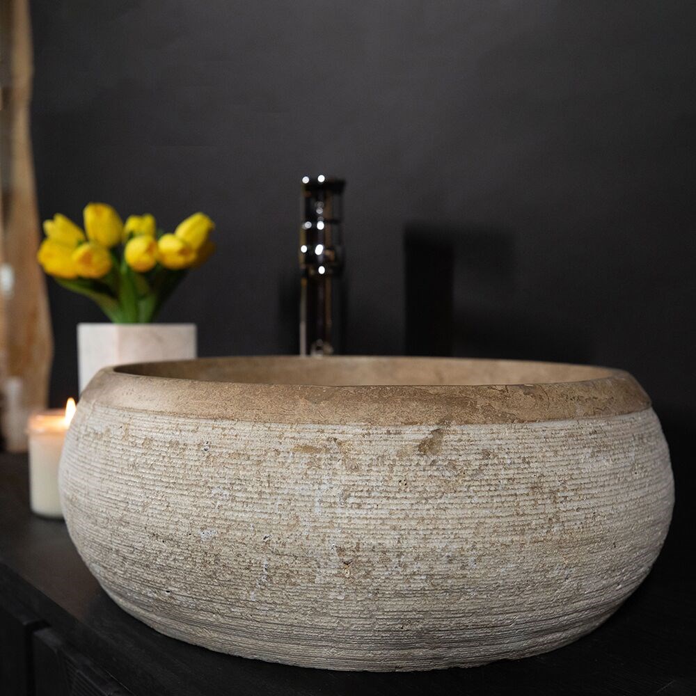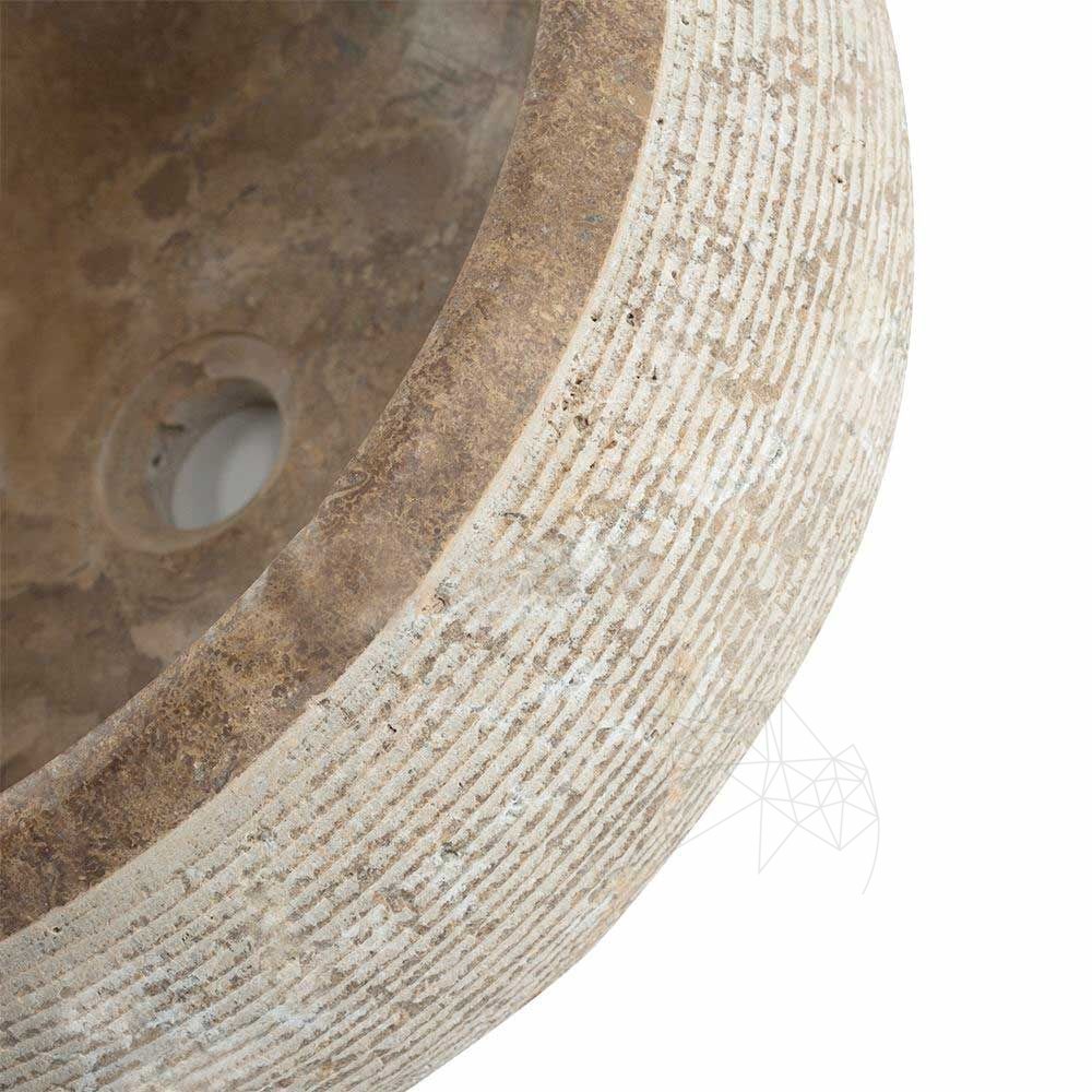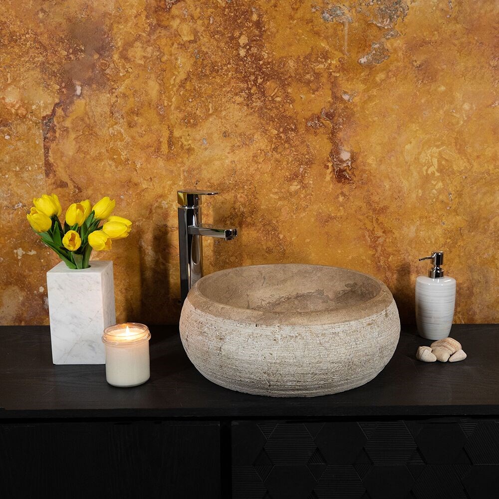 Chiuveta de baie din travertin Latte, model RS-24 are un aspect placut care rezulta din imbinarea a doua tipuri de suprafete: lucioasa la interior si aspra, neprelucrata, la exterior. Astfel, datorita partii interioare, poti asorta chiuveta din travertin la un anumit tip de amenajare interioara: eleganta, clasica, rococo sau moderna, pe cand exteriorul se poate incadra in genurile rustic, mediteraneean, marocan etc.