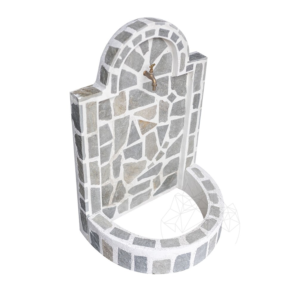 - aspectul cismelei este unul practic, urban si se datoreaza placarii cu ardezie Kavala. Placile se aleg cu grosimi cat mai reduse (1-3 cm), pentru corpul cismelei se foloseste piatra poligonala iar pentru cuva si lateralele corpului placi dreptunghiulare. Astfel aspectul general este unul armonios.