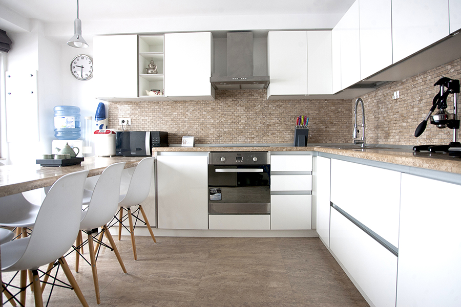 2. Contrablaturi din mozaicuri executate din acelasi material ca blatul. Astfel blatul din travertin Silver (chiar cu finisaj mat) este echilibrat asociat unui contrablat din mozaic travertin Silver. Mozaicul din marmura Cappuccino, cu finisaj antichizat, livreaza nu doar un contrablat din acelasi material cu blatul lustruit ci si o placare verticala de o frumusete deosebita.