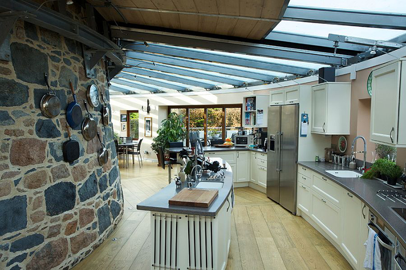 1. Bucatarie “open space” cu piatra decorativa