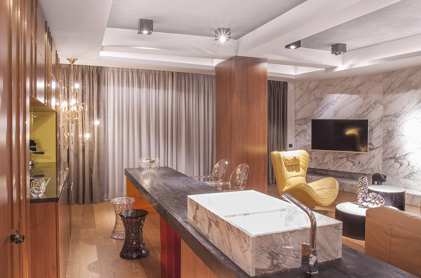 • legatura prin similitudinea amenajarilor din piatra, ceea ce ai in bucatarie pune si-n living (cel putin la nivel de accente), legatura va fi subtila insa suficienta pentru a marca o continuitate.