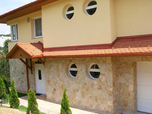 Culoarea aurie a pietrei poligonale Rhodos (lespezi medii sau mici) o recomandă pentru realizarea unei fațade fermecătoare, dar și pentru soclurile cladirilor. Va rezista cu brio ciclurilor de îngheț - dezgheț și va fi un plus din punct de vedere estetic. Nuanța sa te face să te gândești la nisipul plajelor din Grecia și va fi o alegere perfectă pentru un hotel la mare sau pentru o casă de vacanță de pe litoral. În lumina soarelui de iunie, această piatră va arăta superb.