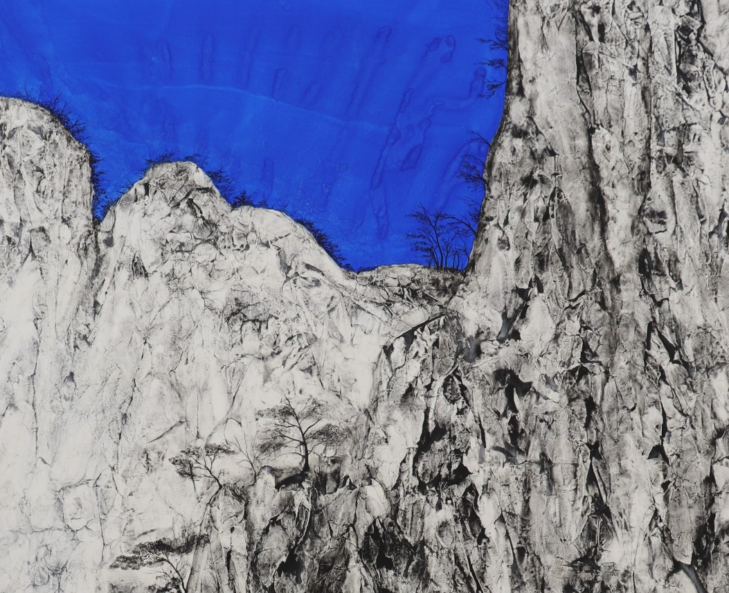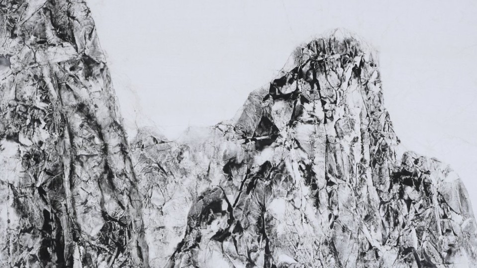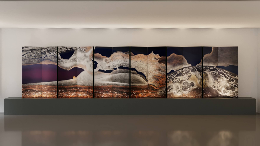 Falling Water, 2020, pigmenti minerali natural si Gofun (alb de perla facut din stridii, scoici) pe hartie japoneza washi, montata pe 5 panouri din lemn interconenctate, sursa foto: Pangrati Design
