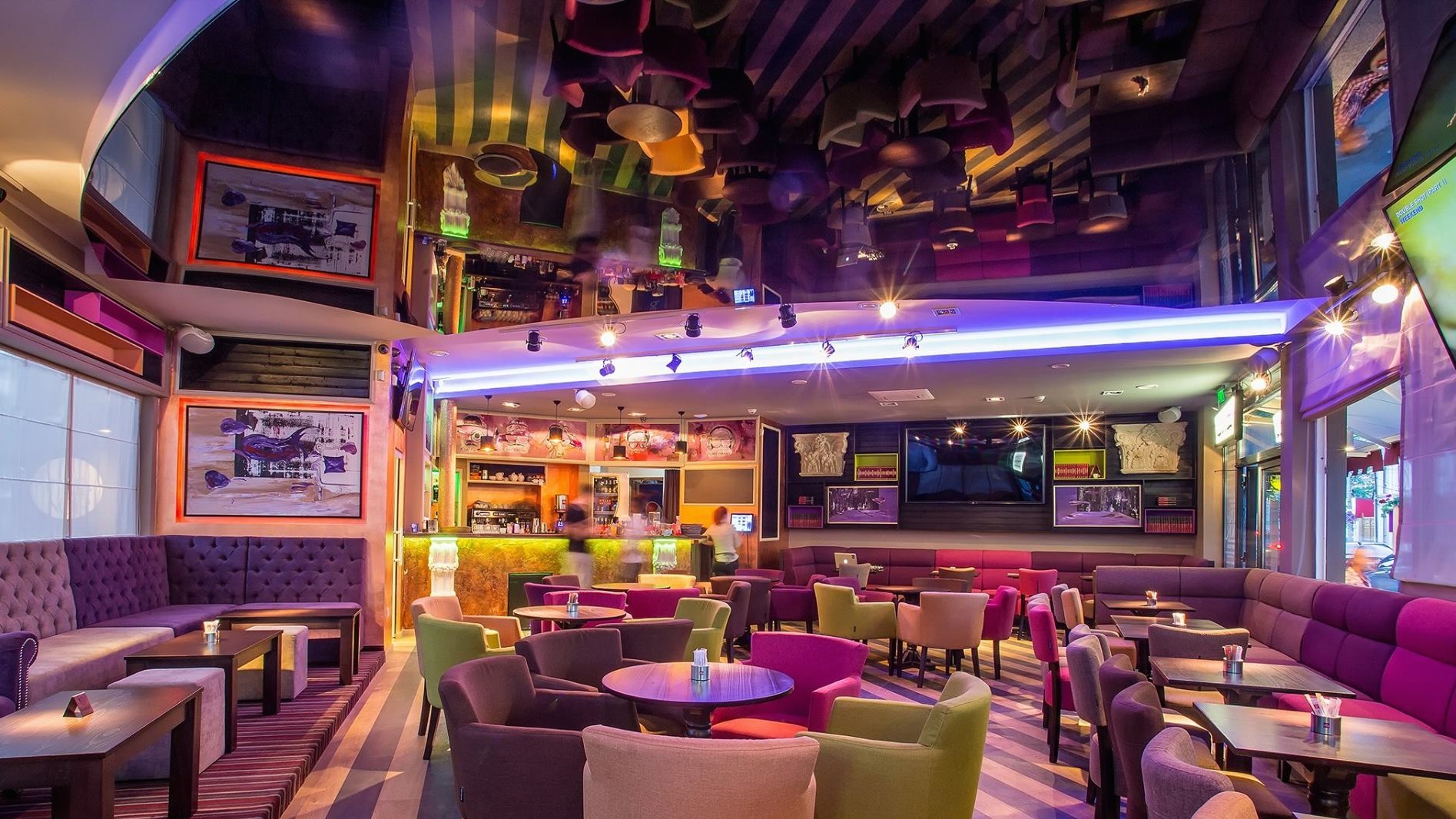 4. In portofoliul Pangrati Design se numara si acea cafenea din Braila in care nu avem cum sa nu remarcam coloristica bogata si efectul de oglinda pe care il are tavanul. De unde te-ai inspirat pentru aceasta amenajare si care a fost efectul pe care ai vrut sa il obtii?