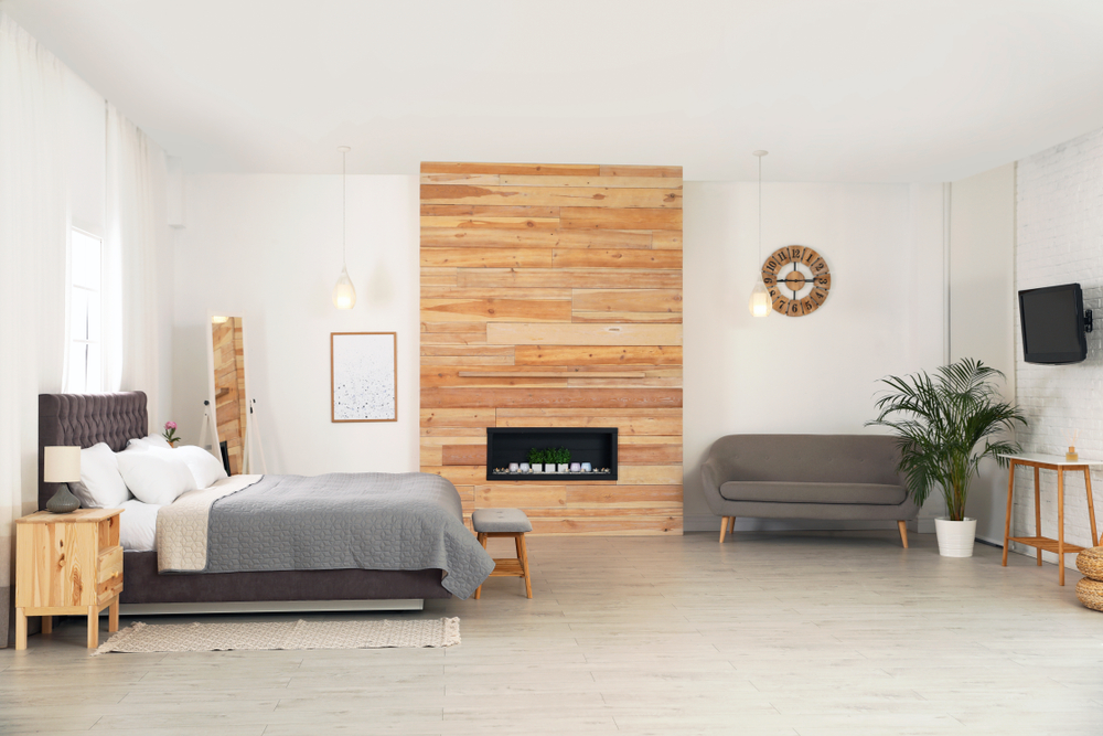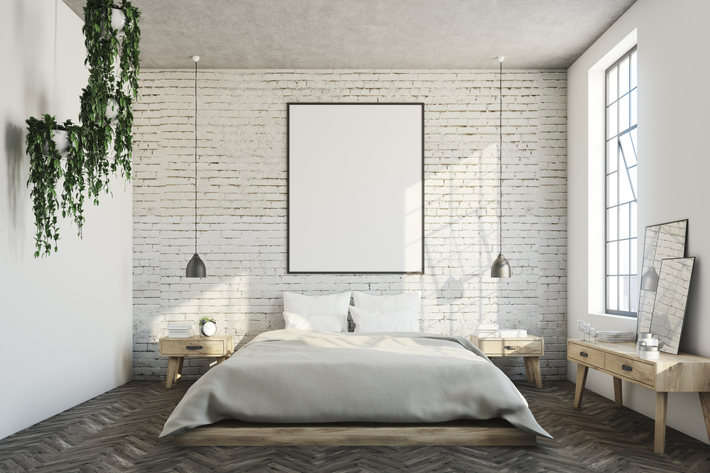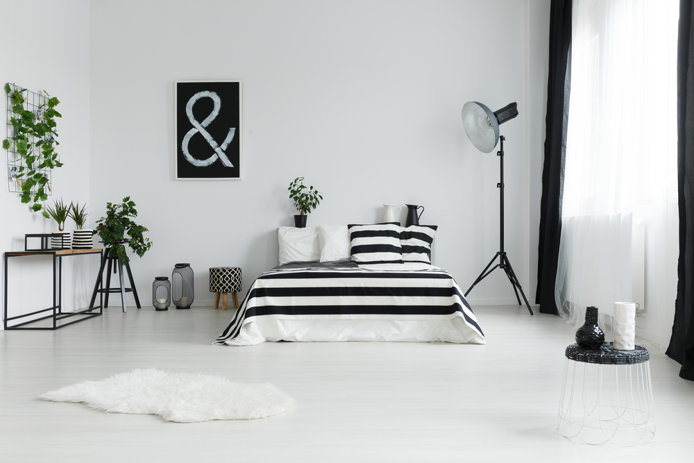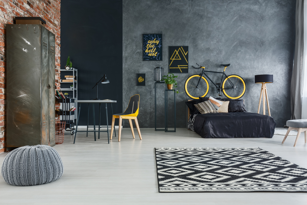 Piatra naturala se poate folosi pentru placarea unui perete sub forma unor paneluri. Patul, poate cel mai important element al camerei: alege un model simplu, din lemn masiv. Ii poti da o nota aparte cu o comoda minimalista la capatul acestuia, pe care sa o poti folosi pentru depozitare. Recomandam folosirea unor corpuri de iluminat in forme geometrice cu finisaj cromat.
