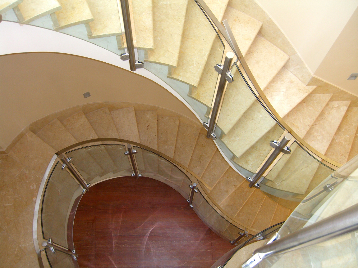 Scarile din piatra cu montaj interior se executa pe o structura din beton si eventual caramida. Placarea scarii se face cu placi cat lungimea treptei din beton, prin taiere direct din lastra la dimensiunile cerute sau cu placi mai mici dupa tehnologia unei placari de pardoseala. Cand alegi tipul de piatra cu care doresti sa plachezi va trebuie sa tii cont de mai multi factori: destinatia scarii, marimea traficului, influenta factorilor de mediu, grosimea treptelor, greutate, pret. Plecand de aceste criterii de alegere iata ce posibilitati ai: