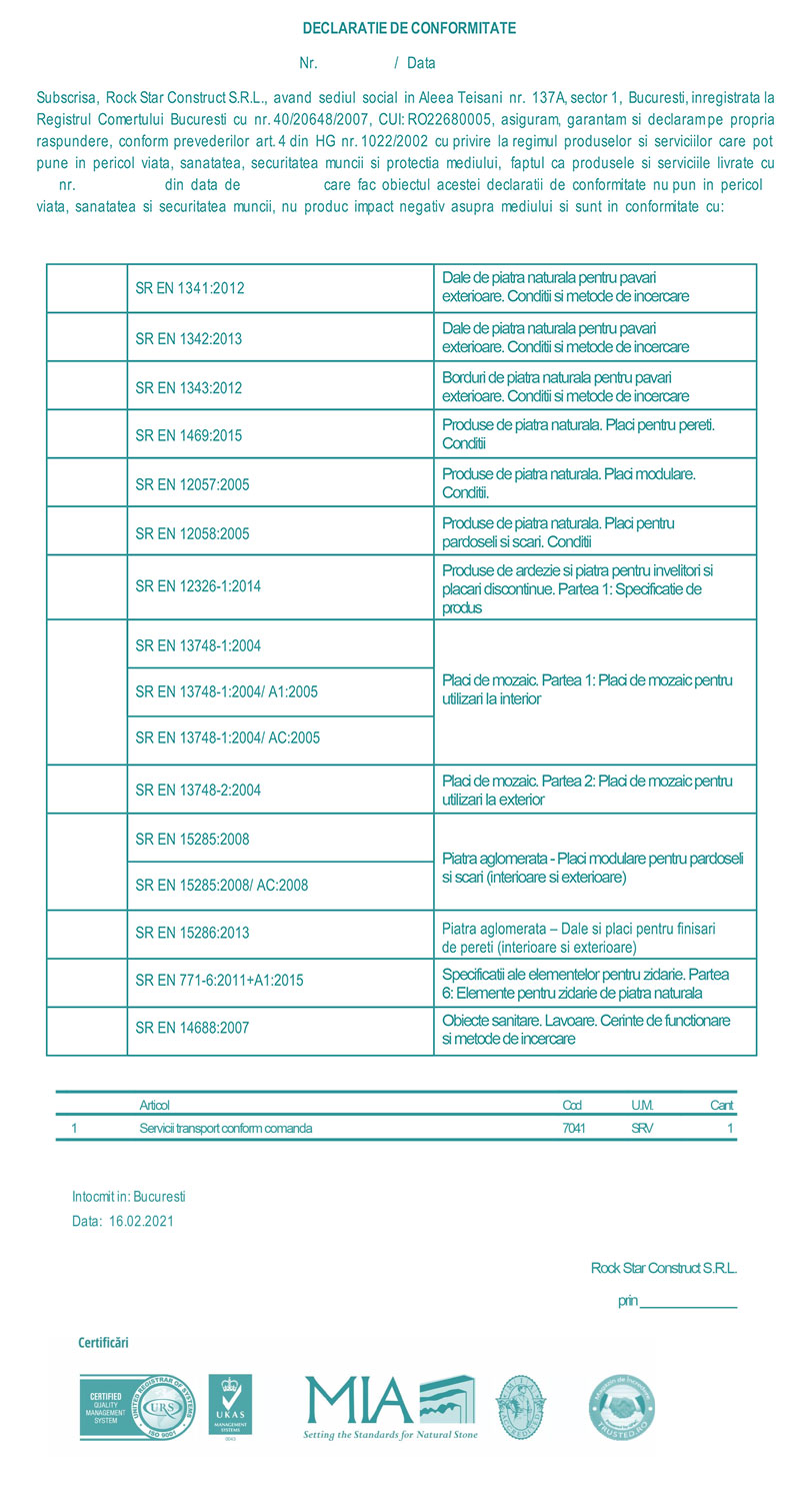 Declaratia de conformitate este un document necesar pentru achizitiile pe firma, in special pentru constructori. Acesta atesta faptul ca produsele nu pun in pericol viata, sanatatea, securitatea muncii, nu produc impact negativ asupra mediului.