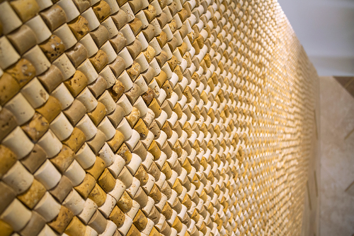 Printre mozaicurile din piatra naturala se disting cele din marmura, ardezie, onix si travertin. Acestea ofera toate tipurile de montaj pe plasa, cu efecte dintre cele mai spectaculoase. Montajul tip “bradut” (herringbone) din marmura Arabescato sau cel din travertin Peach sunt frumoase si dau senzatia de spatiu extins. Finisajul lustruit permite reflexia “pe felii” a luminii ceea ce aduce efecte speciale mai ales in conditiile in care mozaicul este folosit ca accent, acoperind doar un perete sau chiar o bucata din acesta. Montajul tip “tesut” (basket weave) este bine pus in evidenta in mixajul a doua tipuri de marmura marmura Dark Emperador si Burdur Beige sau varianta de travertin antichizat. Daca marmura lustruita si contrastul de culori reprezinta accente moderne linistea travertinului antichizat ofera senzatii de trainicie si perenitate. Montajul “la jumatate de placa“ (gen subway) capata, in cazul mozaicului si in functie de finisajul acestuia, accente speciale ca al marmurei Black oval, iar montajul clasic , “in cruce” isi gaseste o expresie noua asa cum apare in mozaicul din marmura Volakas.