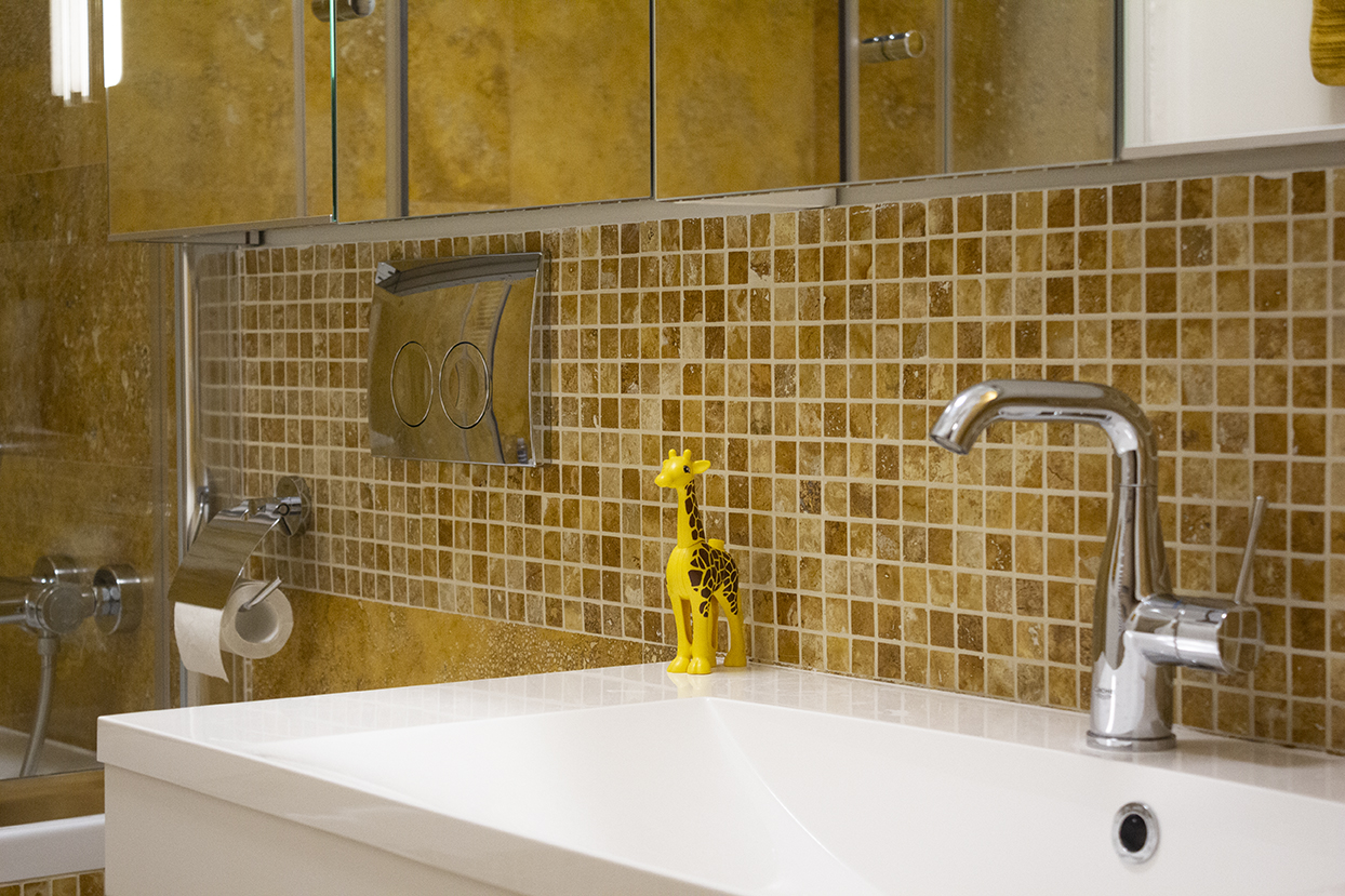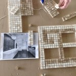 • asezarea primei placi de mozaic. Se apasa usor pe suprafata acesteia pentru a facilita aderenta. Pentru fixare se foloseste un ciocan de cauciuc cu care se bate usor placa de mozaic. In cazul montajului unui contrablat primul rand nu se aseaza direct pe intersectia dintre perete si suprafata blatului ci putin mai sus, golul ramas urmand sa fie astupat cu silicon.