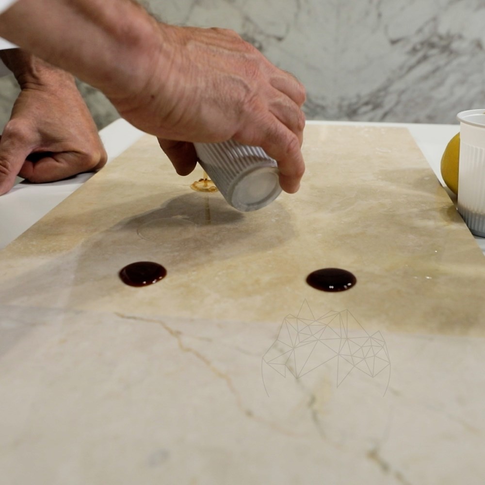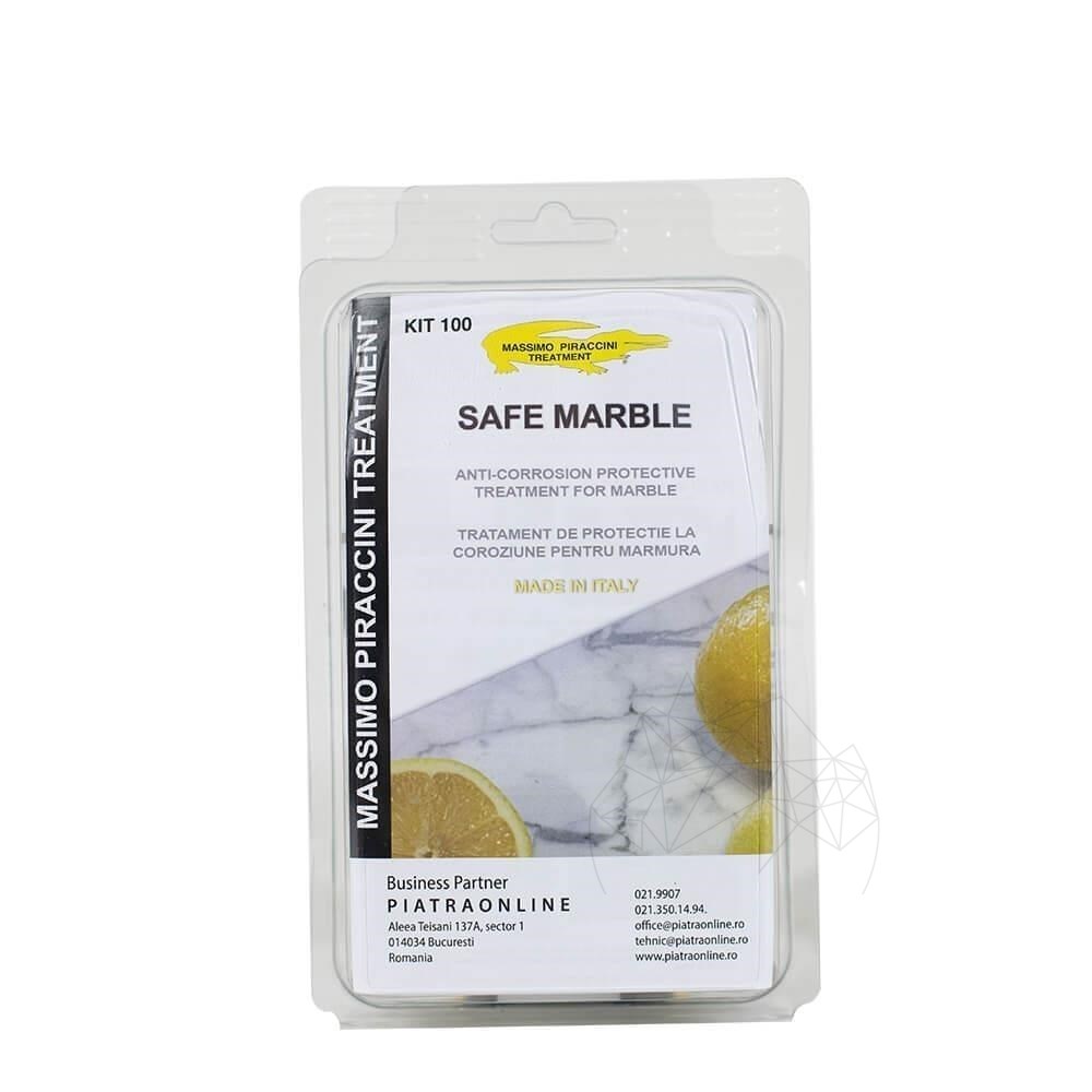 EXPLICATIE: Un tratament care asigura rezistenta suprafetei la pete corozive nu garanteaza ca aceasta nu se va pata nicodata ci faptul ca, folosind-o, se pot obtine cele mai bune rezultate de protectie la atacul acizilor. Astfel o marmura netratata se matuieste imediat ce suprafata a fost atinsa de cateva picaturi de zeama de lamaie, aplicarea Safe Marble in cele mai multe situatii salveaza suprafata pe o durata suficienta pana la indepartarea petelor corozive. Mentinerea cat mai mult timp a rezistentei la acizi (pana la penetrarea stratului de protectie de catre acid) depinde de tipul pietrei, varietatea, taria acidului (acelasi tip de acid poate avea concentratii diferite).