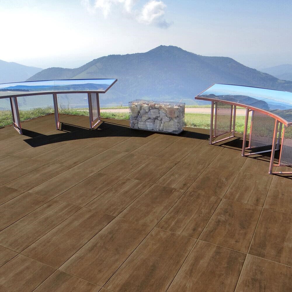 OUTDOOR WOOD 2 CM Foresta Scuro surprinde perfect căldura și eleganța lemnului de nuc în plăci de piatră sinterizată cu efect de lemn natural. Cu nuanțe calde ce variază de la maro închis la tonuri aurii, această placare redă fidel textura, fibra și personalitatea lemnului autentic – fără compromisuri în ceea ce privește durabilitatea.