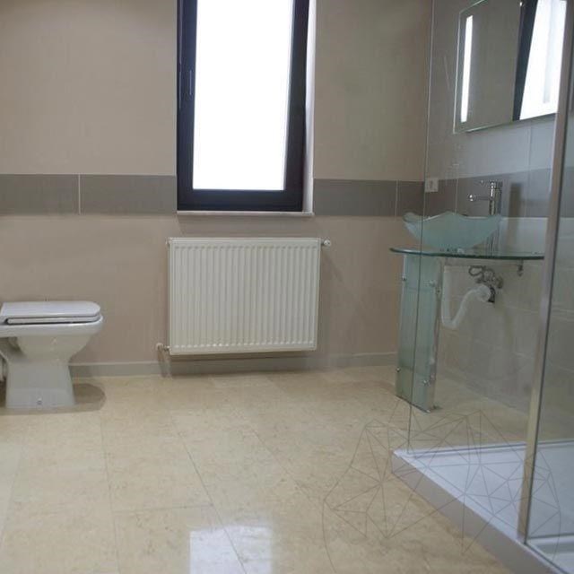 Băi: Textura și nuanțele calde fac limestone-ul perfect pentru crearea unui spațiu relaxant și elegant în baie.