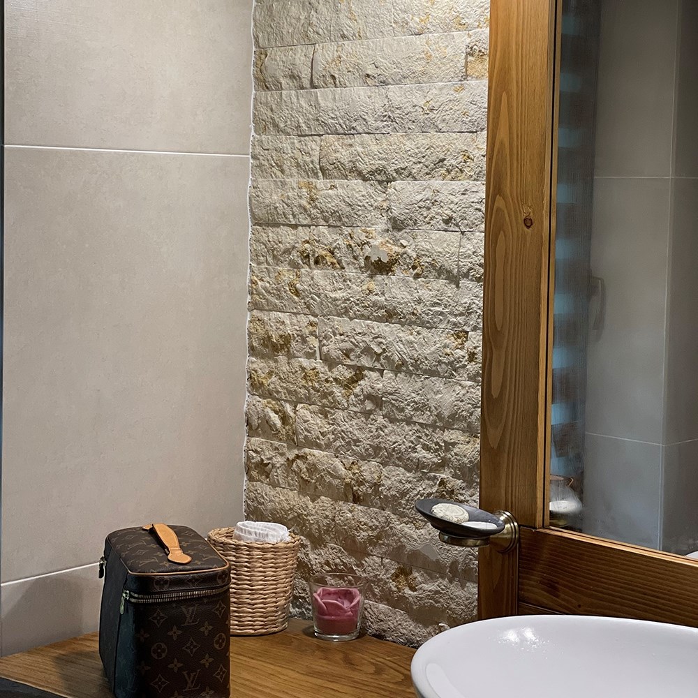 Piatra naturala decorativa interior si exterior Sunny | Placari piatra interioare si exterioare, piatra naturala decorativa din limestone Sunny Dream este livrata cu dimensiuni fixe: 7 x 30 si grosime 1.5 cm. Placarile cu piatra naturala decorativa constituie cele mai bune solutii intr-o multitudine de cazuri precum garduri, fatade, socluri, stalpi, de asemenea, este foarte des utilizata la placari verticale interioare, in spatii publice si rezidentiale.