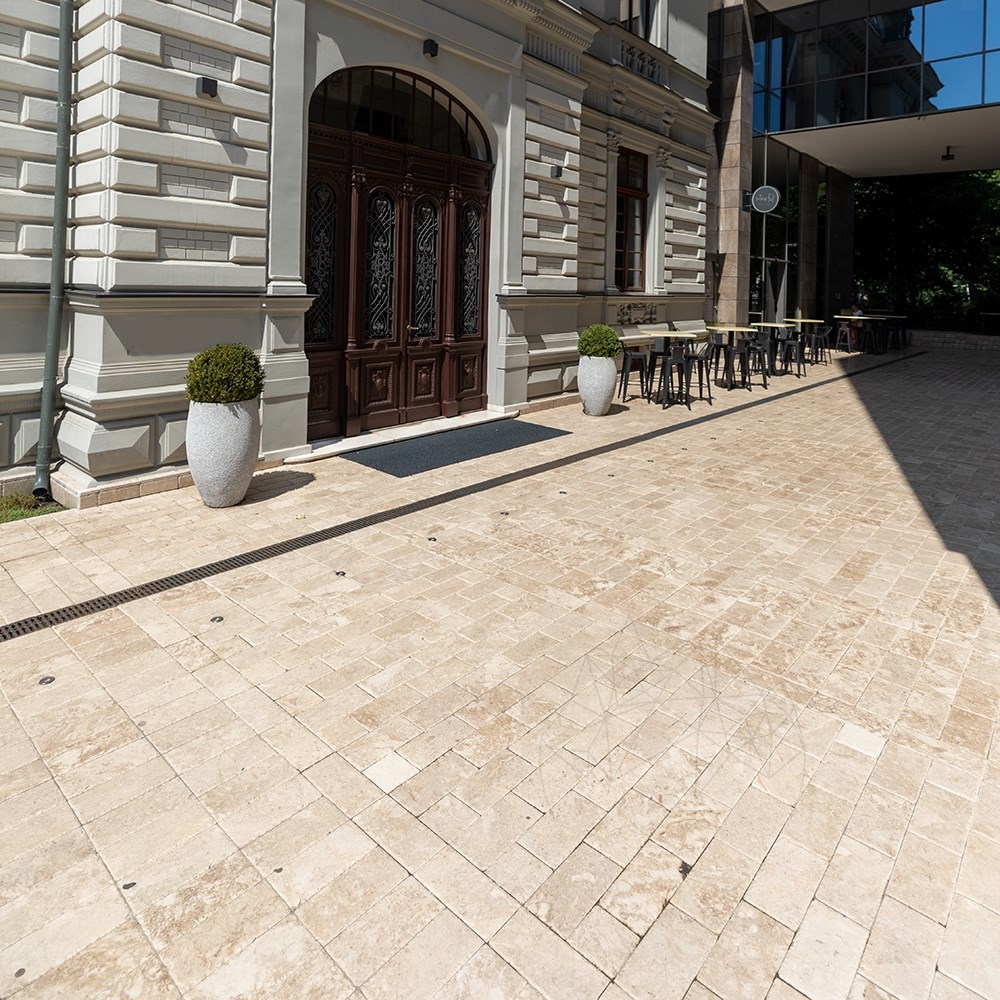 Apectul calm, statuar, al marmurei Cappuccino, periata si daltuita pe margini, creeaza un ambient clasic fara varsta in cadrul oricarei amenajari interioare si exterioare, prin venatura sa in tonuri maro. Acest tip de marmura cu compozitie minerala si transfer termic bun (degivrare) are o rata de absorbtie a apei scazuta si se preteaza perfect spatiilor exterioare. Datorita grosimii de 3 cm, acesta superba marmura crem poate fi utilizata la pavaje exterioare: balcoane, terase acoperite si neacoperite, parcari, alei pietonale etc., atat in cadrul proprietatilor private, cat si in cele publice. Dalele din superba marmura Cappuccino, devine tot mai populara si propune un concept de frumusete universal valabil care poate multumi cele mai pretentioase gusturi in materie de design exterior. Specialistii o recomanda la placarea scarilor exterioare sau la amenajarea piscinelor. Pentru protectie si intretinere usoara, trebuie aplicate doua straturi de impermeabilizant puternic: LTP Mattstone sau LTP Color Intensifier.