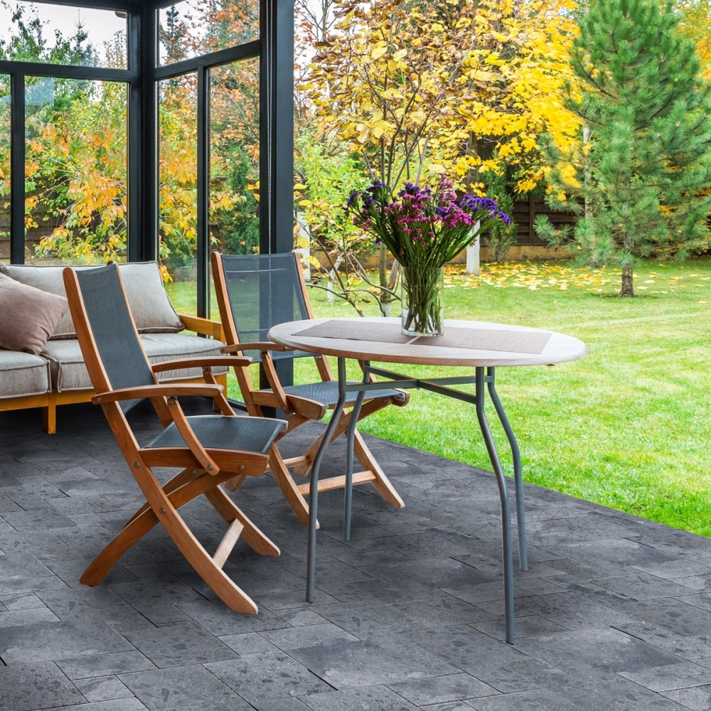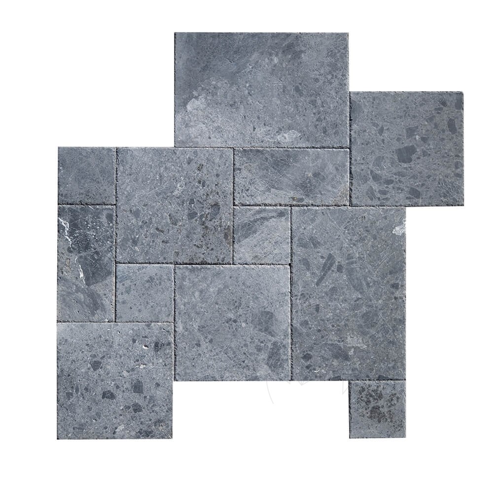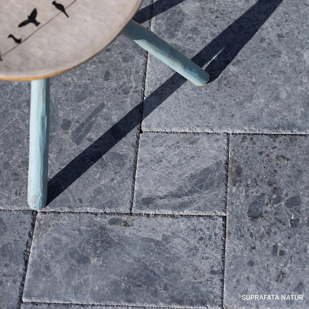 Placile marmura Ceppo Grey model French Pattern sunt folosite ca material de constructie pentru placari orizontale de interior si la exterior pe holuri, living, terase, podeste, intrari, parcuri si gradini. Finisajul periat si daltuit este antislip. Modelul French Pattern este alcatuit din 12 placi (2 seturi). Dimensiunile si amplasarea sunt cele din poza.