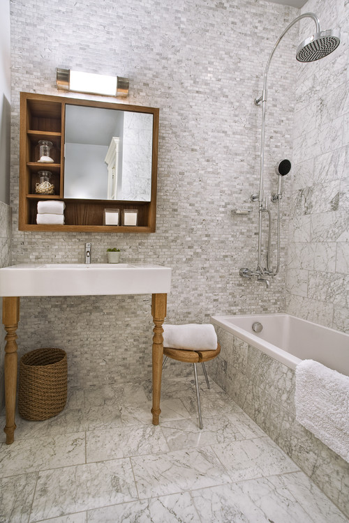 O a doua idee de folosire a marmurei este alegerea mai multor dimensiuni de placă, aşa cum au făcut cei de la Patrick Perez Architect pentru baia din imaginea de mai jos, la care s-au folosit cel puţin trei tipuri de placă, din acelaşi tip de marmură. Peretele pe care se află dulapul cu oglindă este placat cu un mozaic de marmură, pentru pardoseală au fost alese plăci mai mari, pe când peretele de lângă duş a fost placat cu marmură de dimensiuni medii. Rezultatul este interesant, are personalitate iar dinamica este creată pe coordinate fine, pornind de la acest extra-strat vizual al dimensiunii plăcilor.