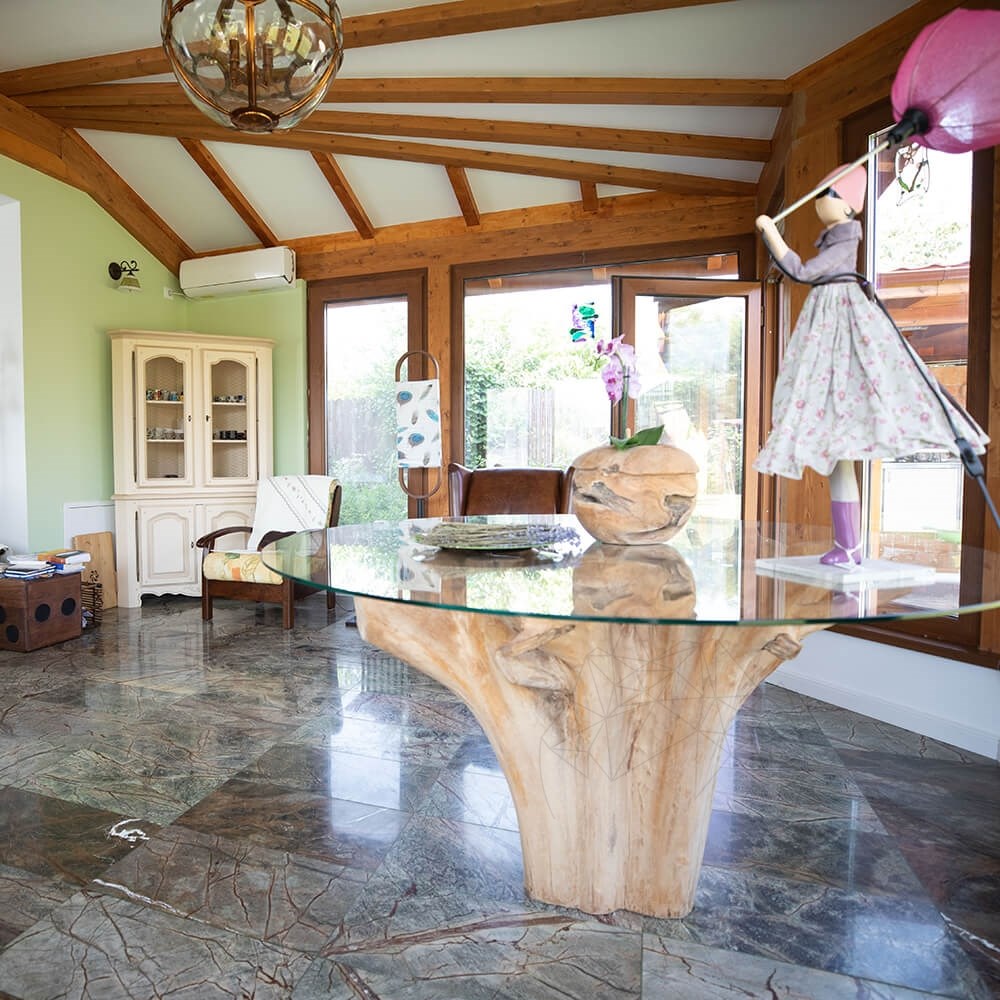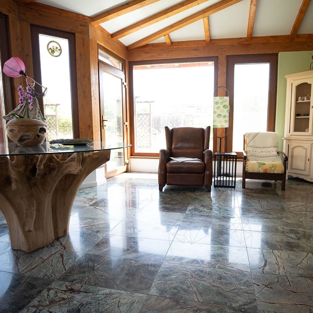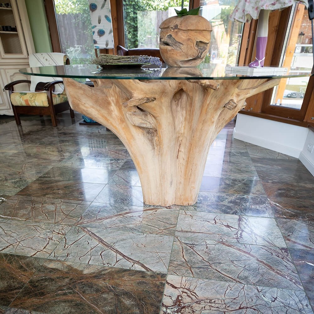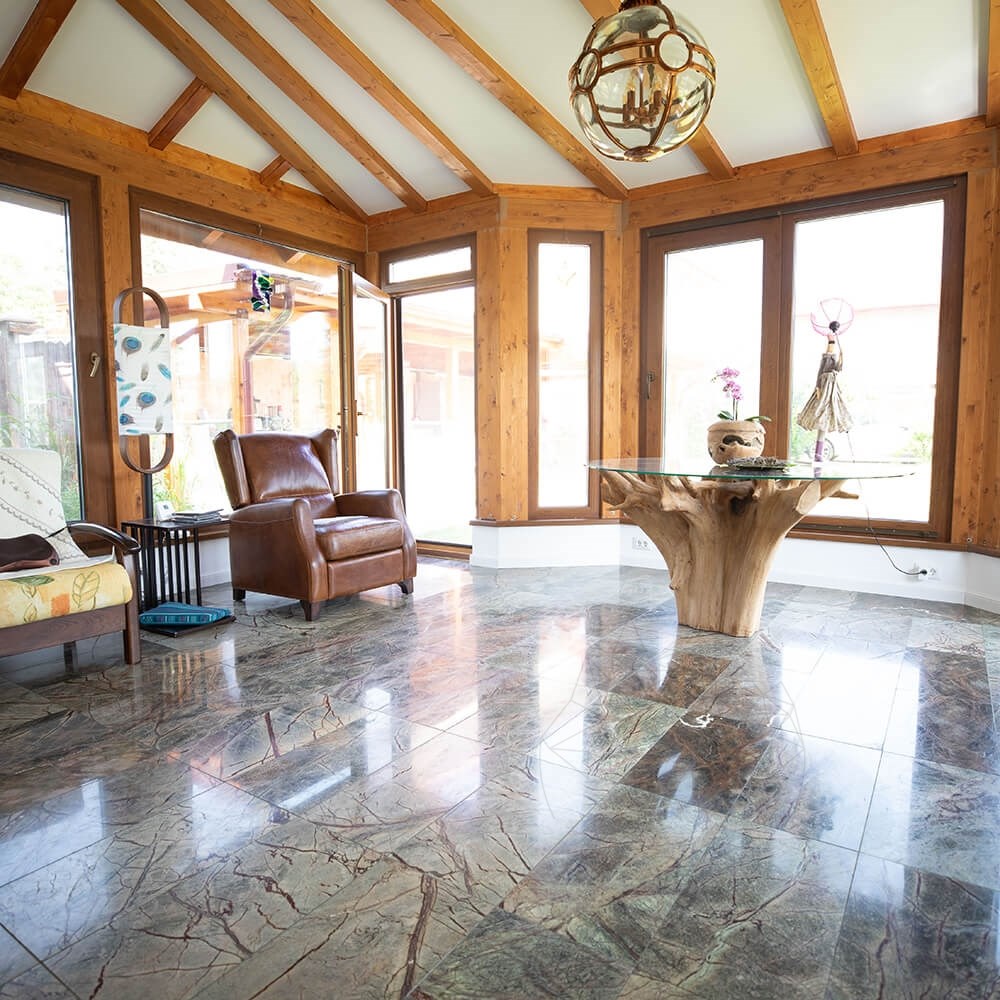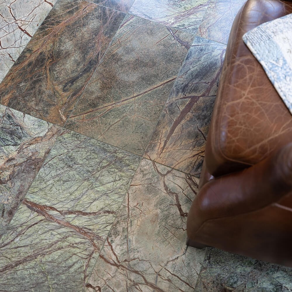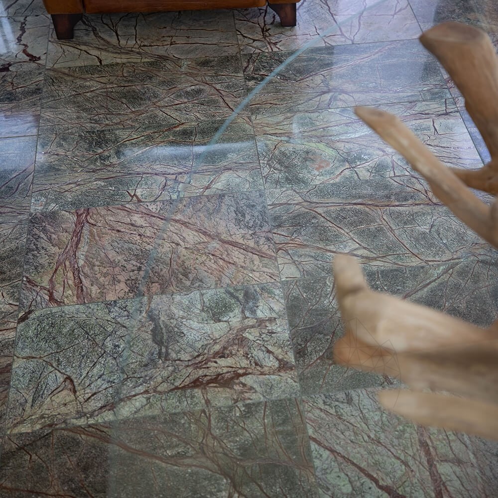 O harta din frunze abia palite de vantul toamnei. Osatura pamantului vested. De sus vazand hemoragia de drumuri pribegind printre coline. Asterne marmura Rainforest Green peste podeaua din living ori coboara din pat dimineata, in dormitor, peste aceste schelete de insecte cristalizate, ca niste amintiri in culorile originare. Lumina impinsa pe suprafata vine inapoi in nuantele apelor unui fluviu lenes. Reflexe verzi amare se strecoara cu gratie printre nervuri roscate. Montajul “prin periere” asigura aderenta. Ca la toate placile mari, adezivul se imprastie pe substrat si pe placa. Marmura, sensibila si delicata, se trateaza. Detergentii comerciali (acizi) o ard. Cei specializati o curata dupa montaj, indepartand resturile de adeziv si chit. Impermeabilizarea suprafetelor se face dupa curatare, pentru protectie si pastrarea frumusetii. Dupa tratament, intretinerea zilnica nu e grea. Nici mentenanta periodica.