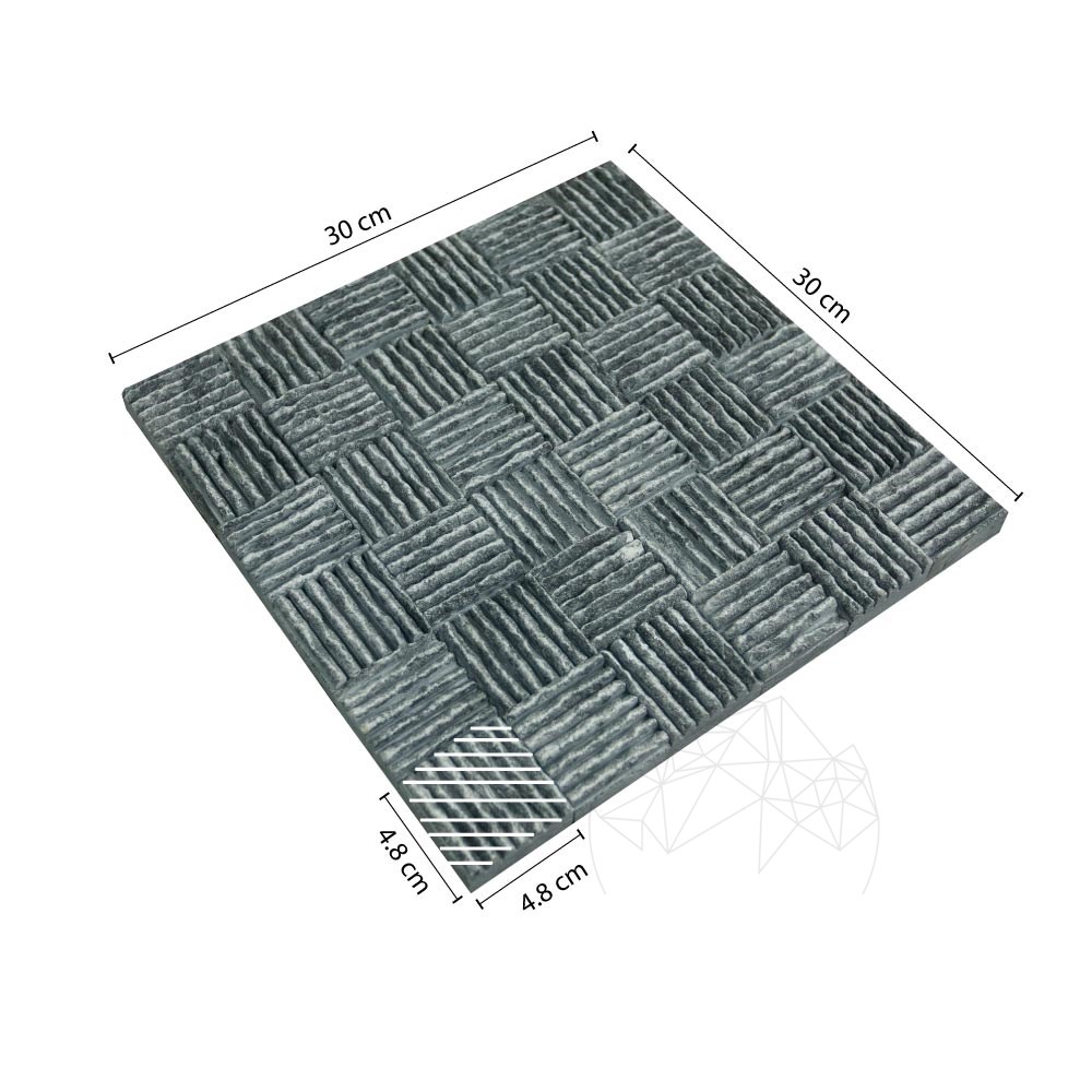 Acest produs spectaculos din marmura Black cu finisaj denumit de noi ''Dizzy'', finisaj ce aduce gama de mozaicuri intr-o noua etapa a finisajelor cu piatra naturala. Fragmentele de marmura sunt premontate pe o plasa de 30x30cm, ce asigura un montaj corect, usor si rapid.