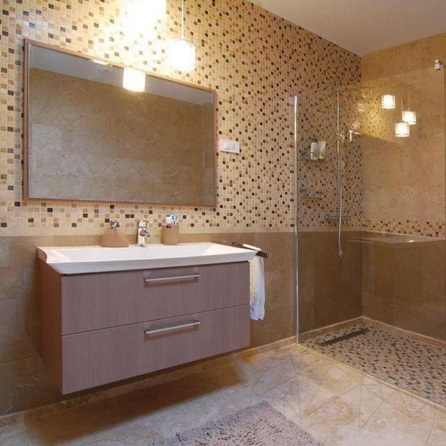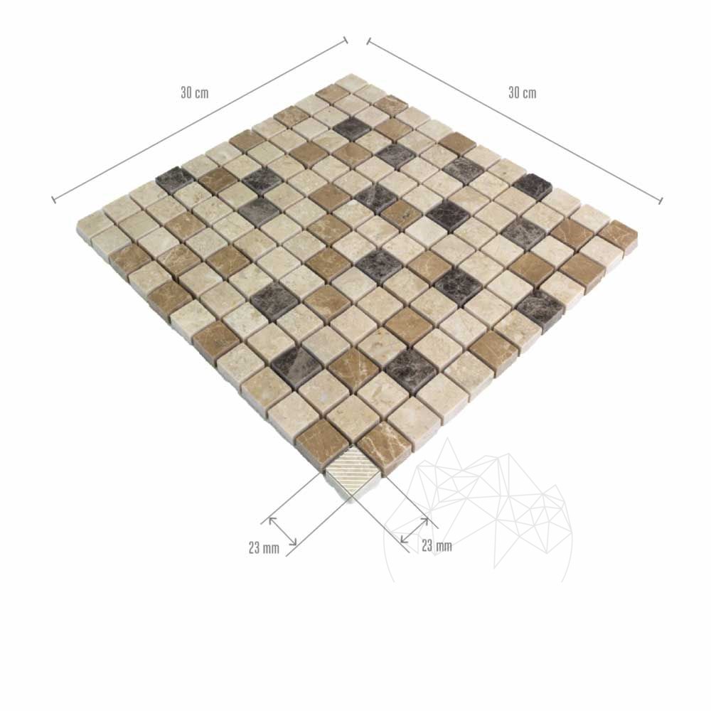 Mozaicul Mix Marble produs din marmura polisata este recomandat pentru amenajari interioare care vor sa creeze o atmosfera dinamica chiar si pe spatii mici: bai, bucatarii, holuri etc. Tonurile de crem inchis si deschis destind incaperile in care aceasta piatra este prezenta. In cadrul amenajarilor interioare, acest mozaic din marmura este pus in valoare prin combinarea cu alte pietre naturale in culori compacte, neutre, dintr-o plaja cromatica apropiata (crem, maro, latte). Se incadreaza foarte bine stilurilor decorative mediteraneean, rustic, clasic, retro sau modern. Bucatile de mozaic din marmura Mix Marble cu finisaj polisat, vin deja montate pe plase de 30.5 x 30.5 cm, ceea ce face usor de realizat placarea cu acest produs relaxant si primitor.